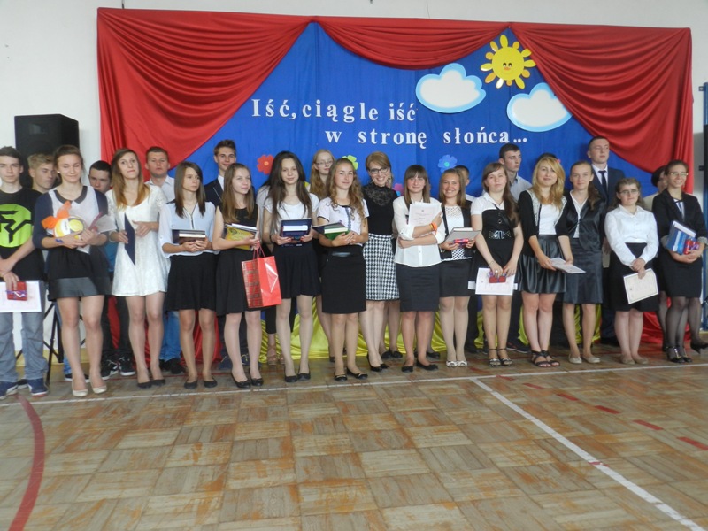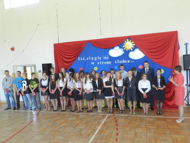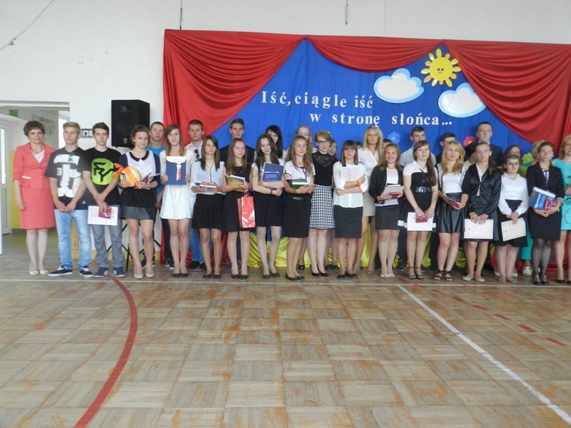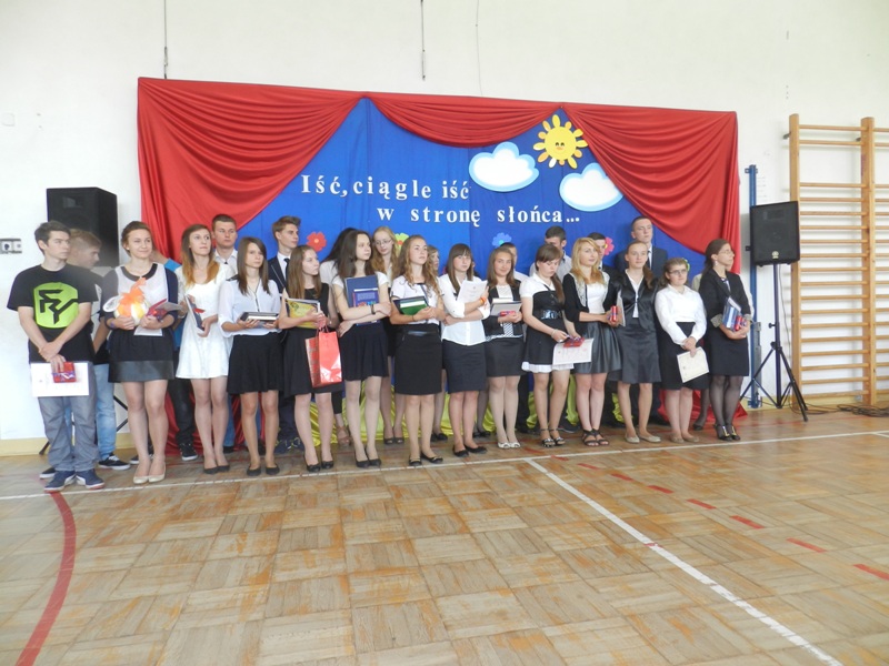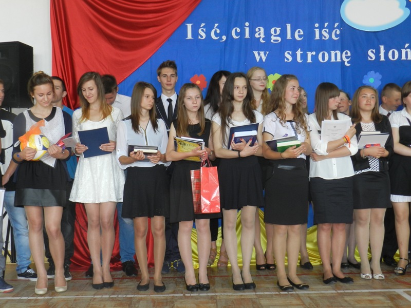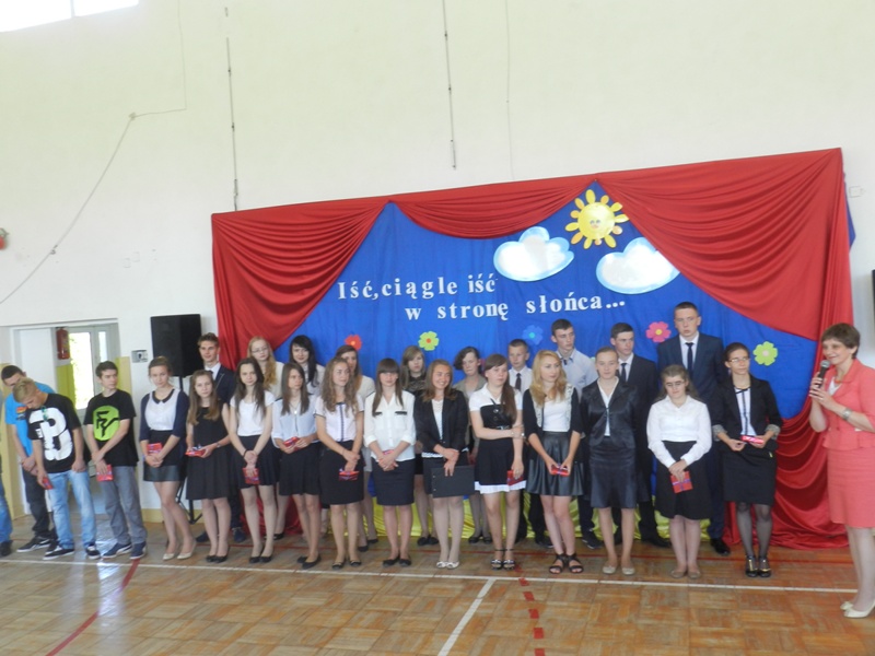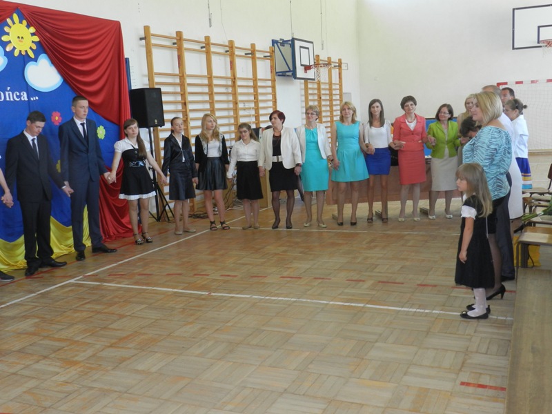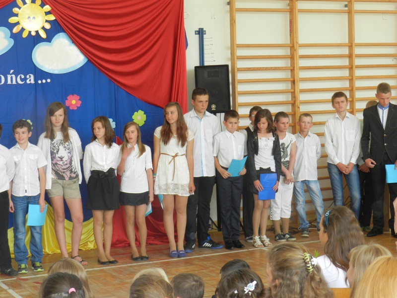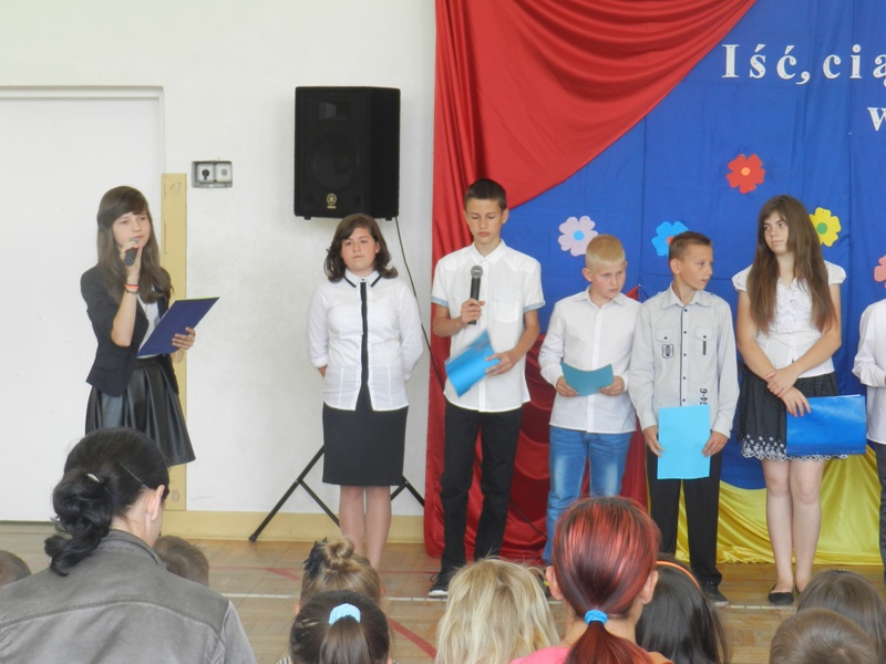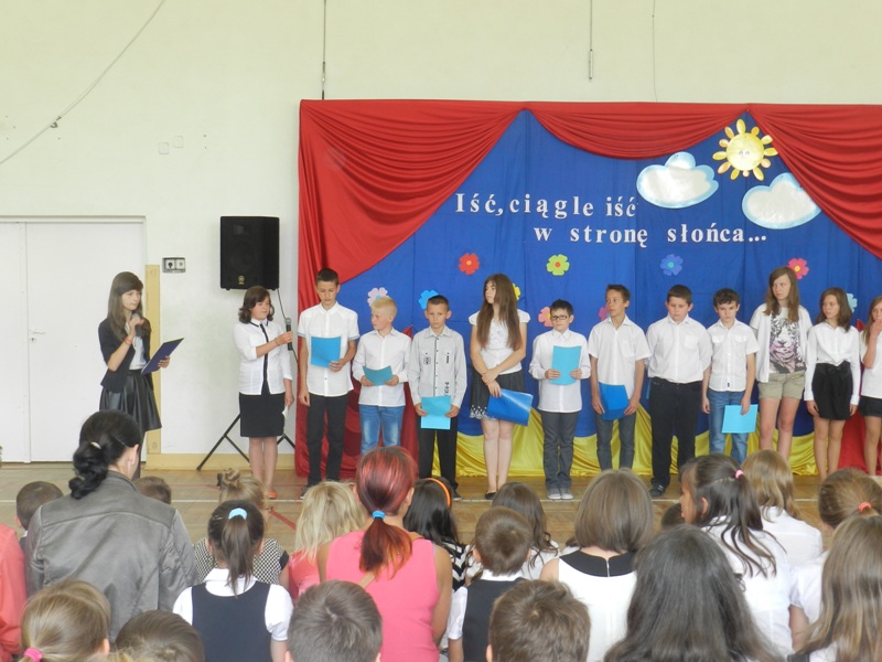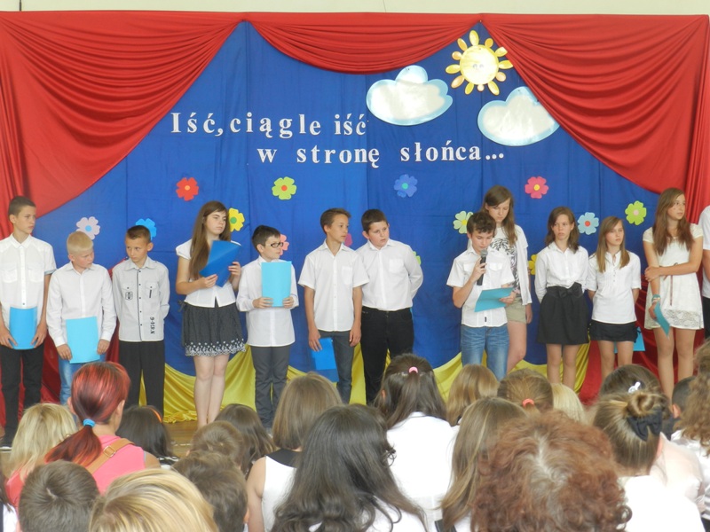 Na początku pożegnali się uczniowie III klasy gimnazjum. Po części artystycznej w ich wykonaniu nastąpiło wręczenie świadectw i nagród za wyniki w nauce oraz osiągnięcia sporcie. Następnie nadszedł czas na część artystyczną przygotowaną przez uczniów klasy VI. Po niej nastąpiła część oficjalna, podczas której zostały wręczone świadectwa z wyróżnieniem oraz nagrody dla dzieci z oddziałów przedszkolnych i uczniów klas I-VI. Pani dyrektor Dorota Dobosz życzyła uczniom i pracownikom szkoły udanego i bezpiecznego wypoczynku podczas wakacji. Akademię wraz z młodzieżą przygotowały panie Iga Ziobro i Małgorzata Brudnicka.