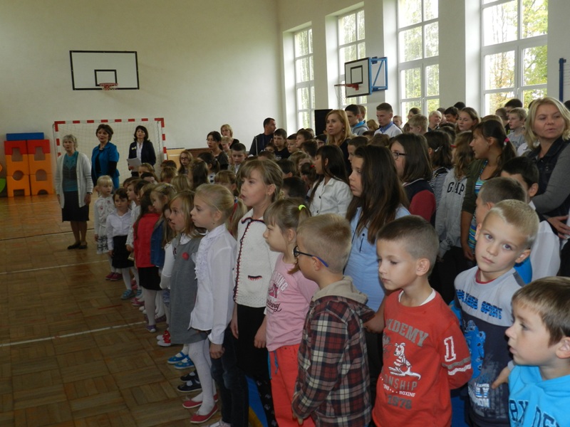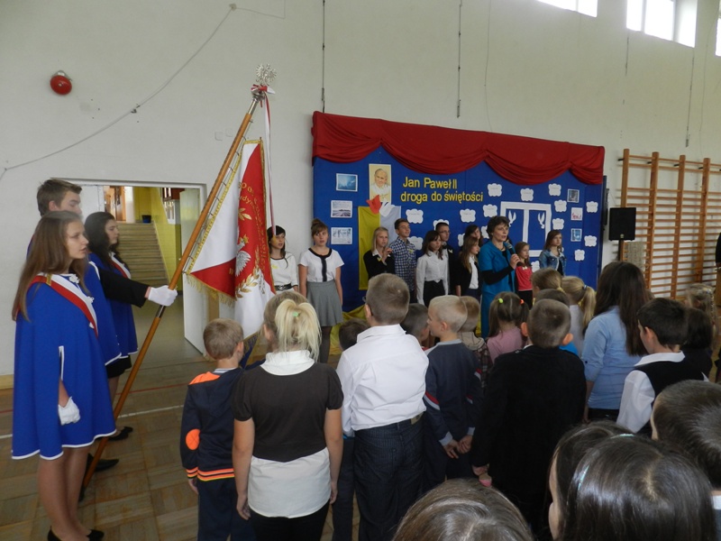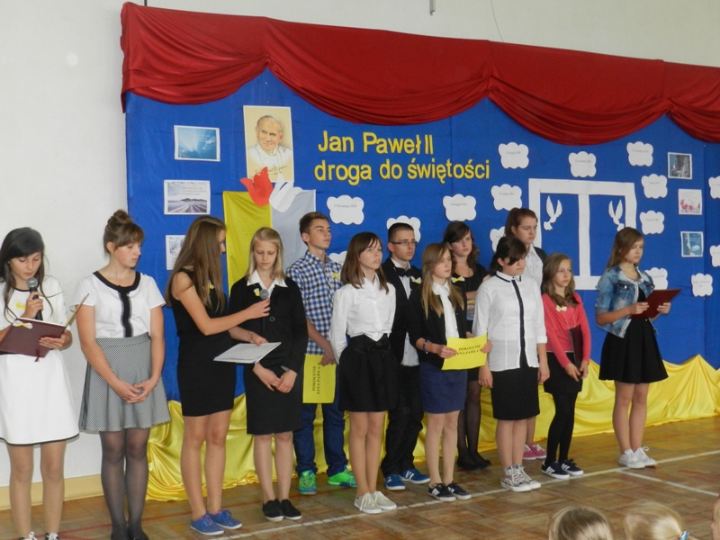 Na początku akademii pani dyrektor powitała wszystkich uczniów, nauczycieli i pracowników szkoły oraz przybliżyła postać Karola Wojtyły. Następnie uczniowie gimnazjum z kl. 1 - 3, przygotowali montaż słowno–muzyczny pod kierunkiem pani Beaty Czwarno, a dekoracje na sali gimnastycznej przygotowała pani Grażyna Cichowlas.
