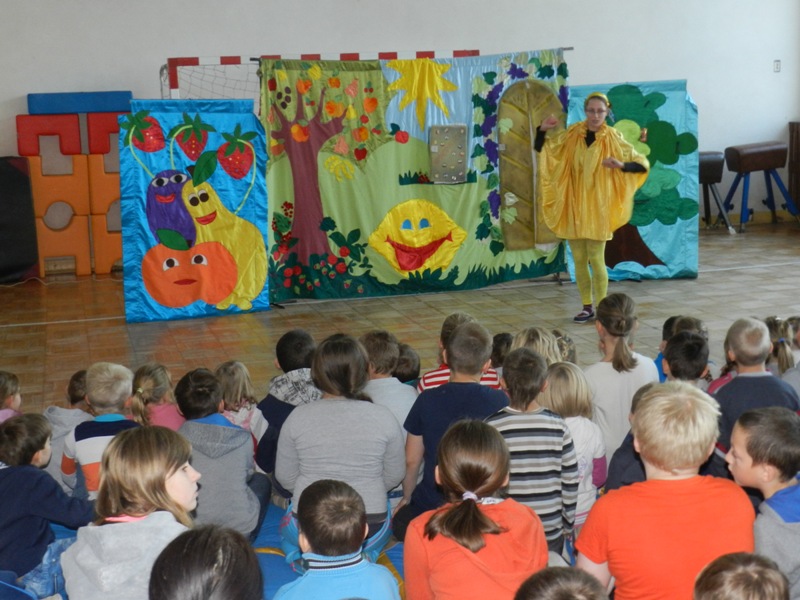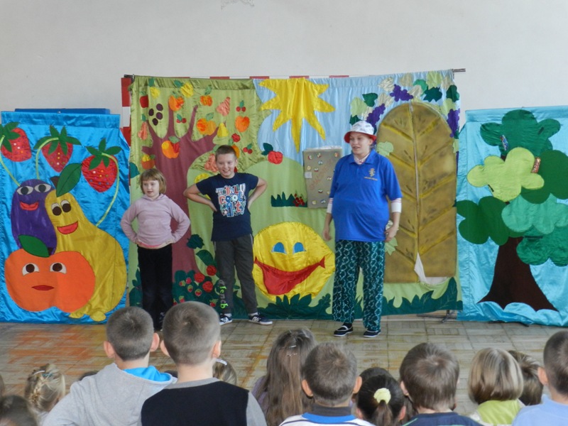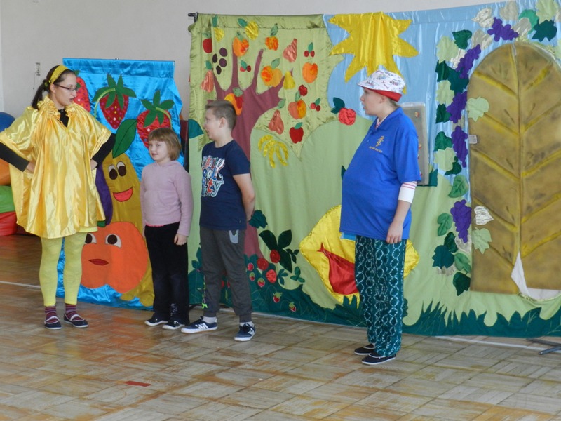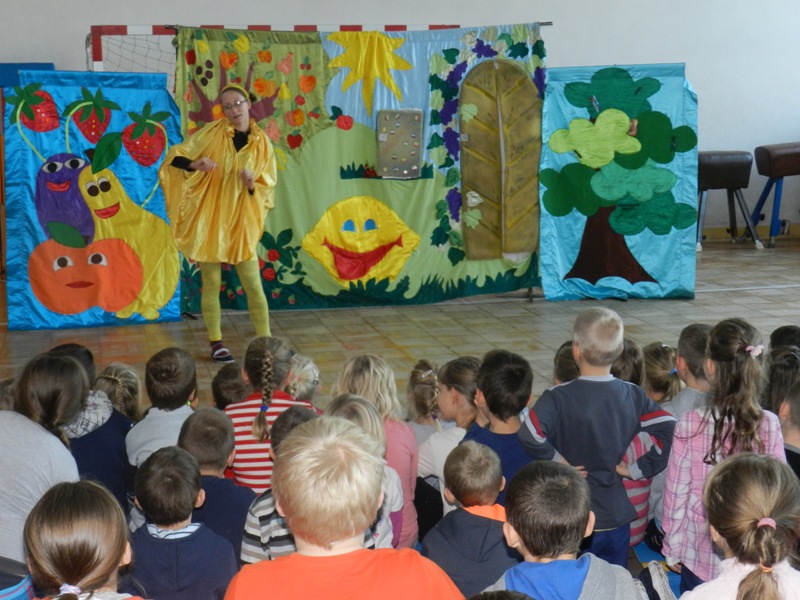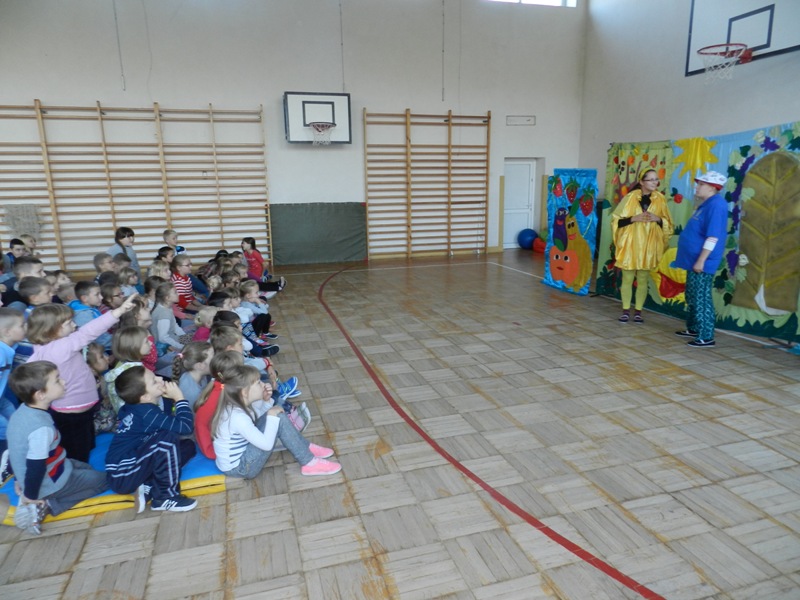 „Gdy jemy witaminki – to mamy uśmiechnięte minki” – tak przekonywali uczniów klas 0- V bohaterowie przedstawienia, które odbyło się w naszej szkole 31 października. Aktorzy ze Studia „Magik” w Białymstoku zaprezentowali historię Pimpusia Sadełko, który uwielbiał słodycze. Pewnego dnia Pimpuś znalazł się w Krainie Witaminek, gdzie do zmiany nawyków żywieniowych przekonywała go urocza Witaminka C. Dzięki niej i zaangażowaniu widzów główny bohater zaczął regularnie ćwiczyć, myć zęby i zdrowo się odżywiać. Wszyscy uczniowie mieli okazję przypomnieć sobie jak ważna jest higiena osobista i zdrowy tryb życia