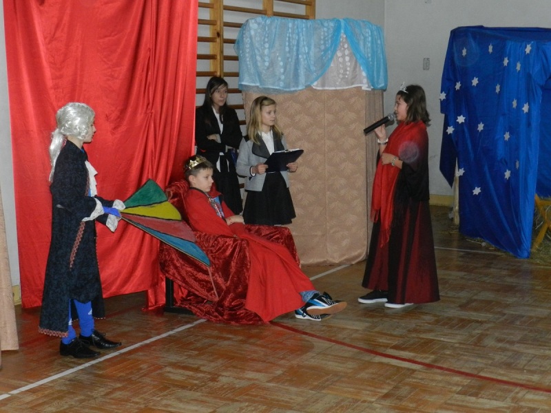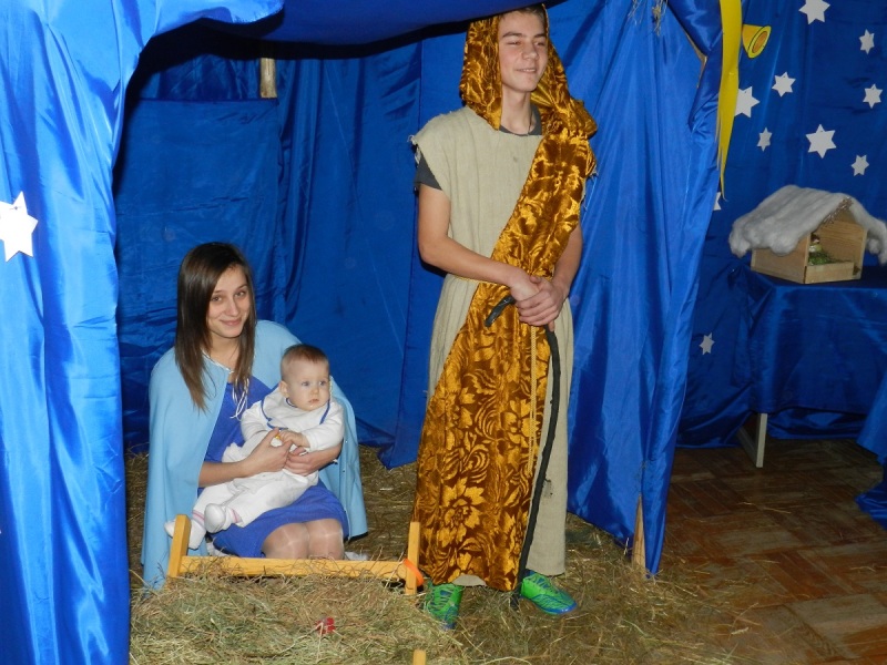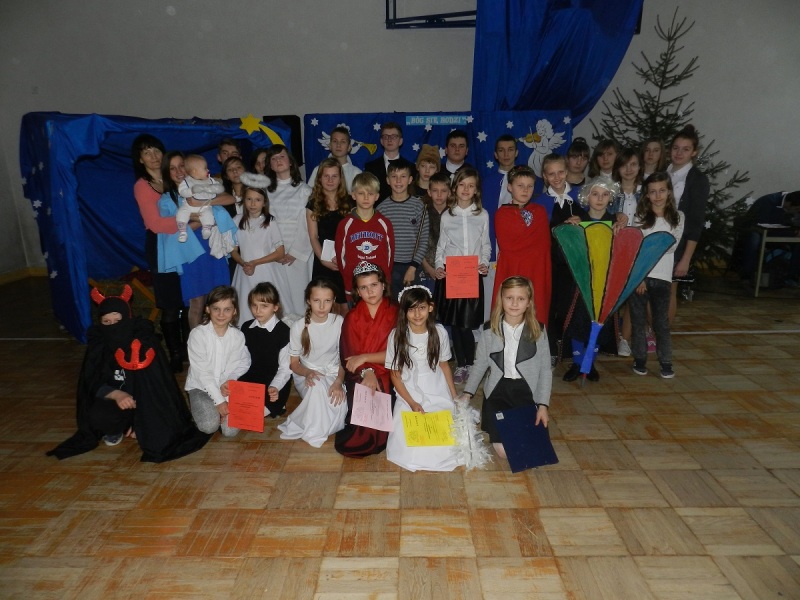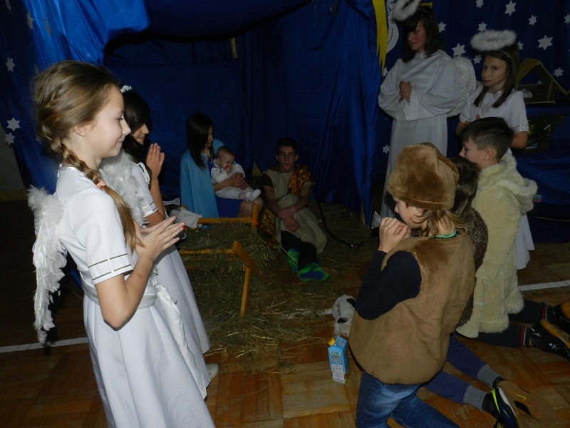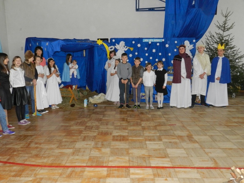 Uczniowie zaprezentowali przedstawienie pt. ,,Bóg się rodzi” pod opieką pani katechetki – Beaty Czwarno. W jasełkach wzięły udział uczniowie szkoły podstawowej z kl.5, gimnazjum z kl.1-3 oraz chór, który upiększał inscenizację.
