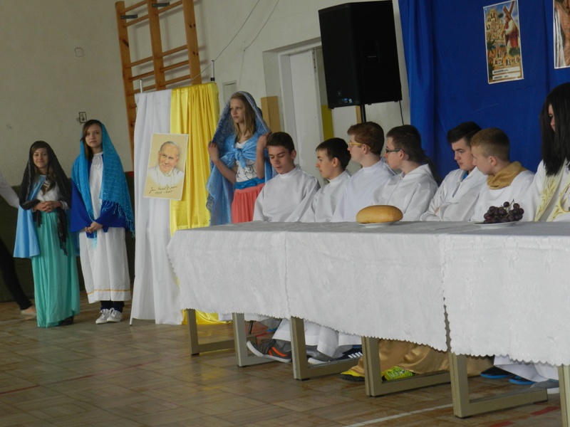 Podczas akademii wspomnieliśmy postać Świętego Jana Pawła II, i zaśpiewaliśmy ,,Barkę’’, by uczcić 10 rocznicę śmierci.