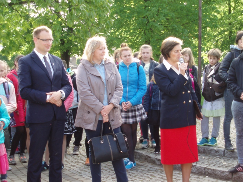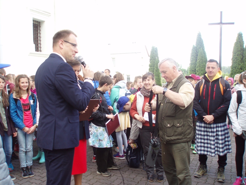 Początek rajdu miał miejsce przy Pomniku Raka w Jedlińsku, gdzie uczestnicy zostali powitani przez p. dyrektor Bożenę Cieślak oraz Wójta Gminy - p. Kamila Dziewierza i Przewodniczącą Rady Gminy - p. Anetę Żurowską.