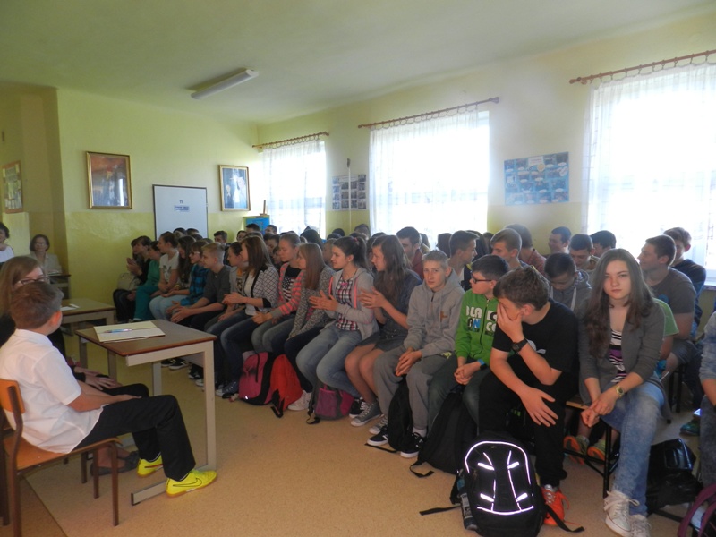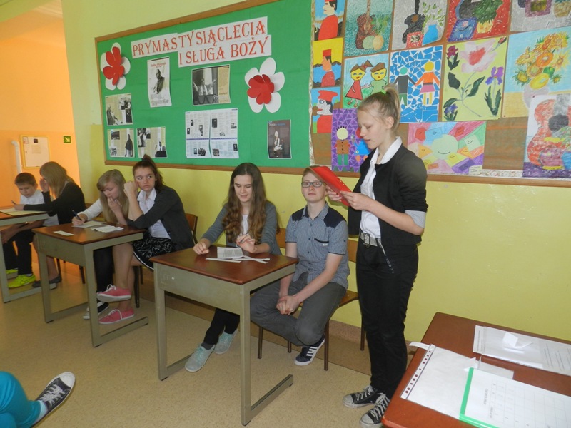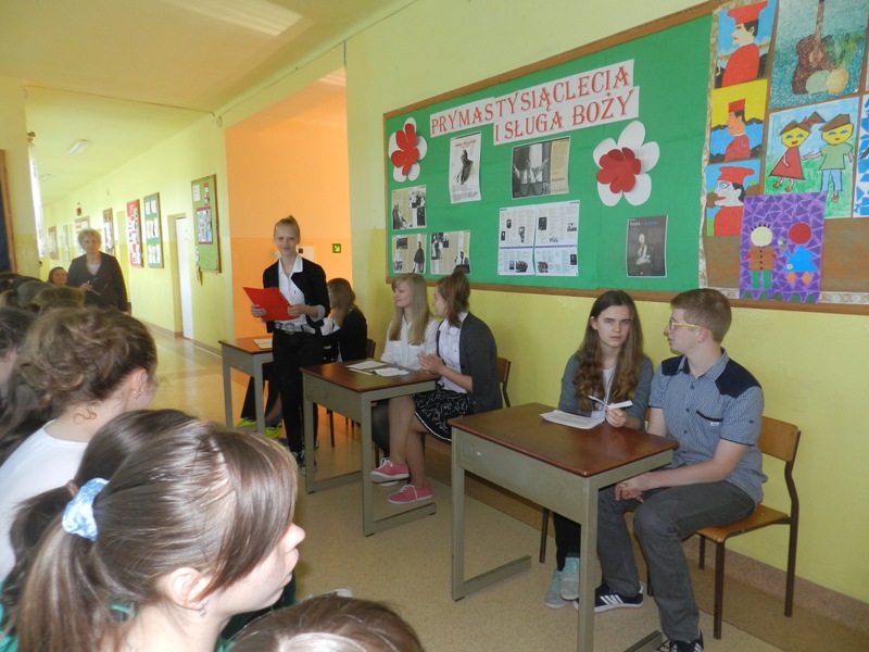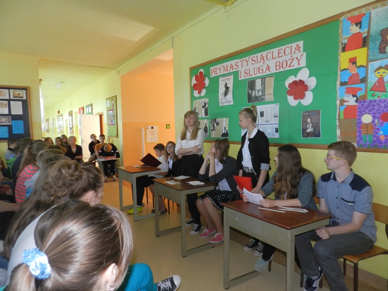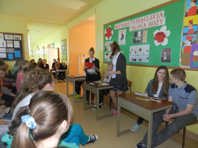 29 maja 2015 roku sześcioro uczniów naszego gimnazjum stanęło do rywalizacji w szkolnym konkursie wiedzy o Patronie Szkoły. Pozostali uczniowie gimnazjum mogli obserwować reprezentantów swoich klas oraz słuchać udzielanych przez nich odpowiedzi. Cała szóstka była bardzo dobrze przygotowana. Uczniowie doskonale znali daty i wydarzenia z życia Kardynała Stefana Wyszyńskiego. O pierwszym i drugim miejscu rozstrzygnąć musiały pytania dodatkowe.