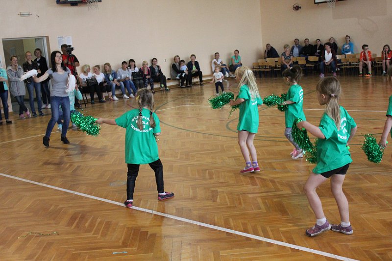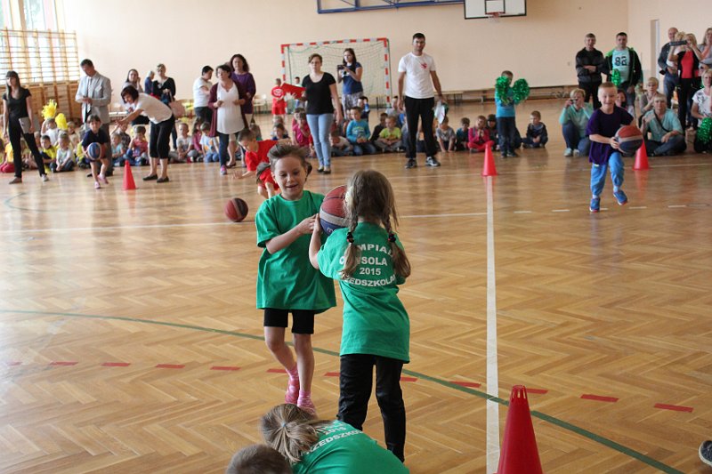 Olimpiada rozpoczęła się uroczystym wniesieniem flagi olimpijskiej i zapaleniem znicza. Następnie odbyło się ślubowanie i tuż po nim prezentacja różnokolorowych drużyn. Nasze dzieci (w zielonych strojach) przepięknie wykonały układ taneczny do utworu „Samba de Janeiro”, rytmicznie poruszając przy tym zielonymi pomponami.