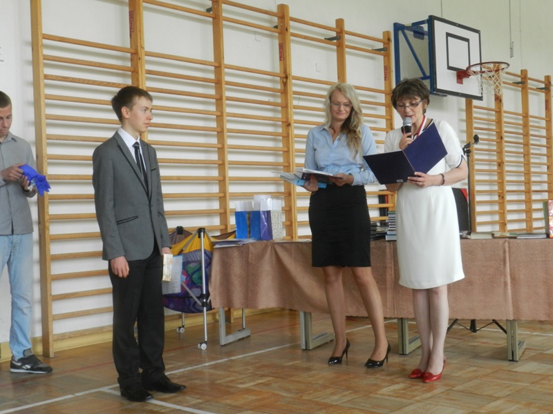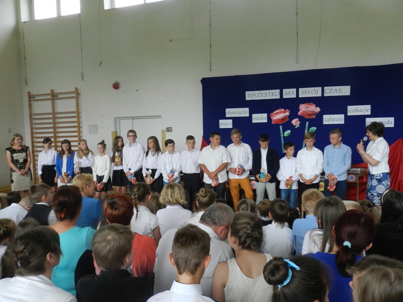 Po dziesięciu miesiącach nauki i pracy przyszedł czas na podsumowanie. W obecności wszystkich uczniów, nauczycieli, pracowników szkoły, przybyłych rodziców, Pani Dyrektor Dorota Dobosz wręczyła wyróżniającym się uczniom świadectwa z czerwonym paskiem, dyplomy i nagrody.