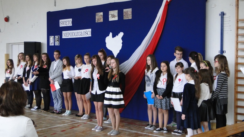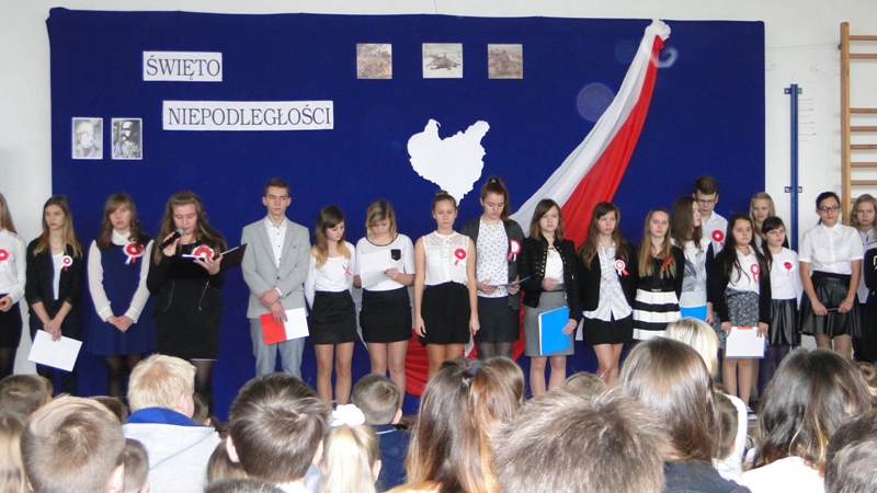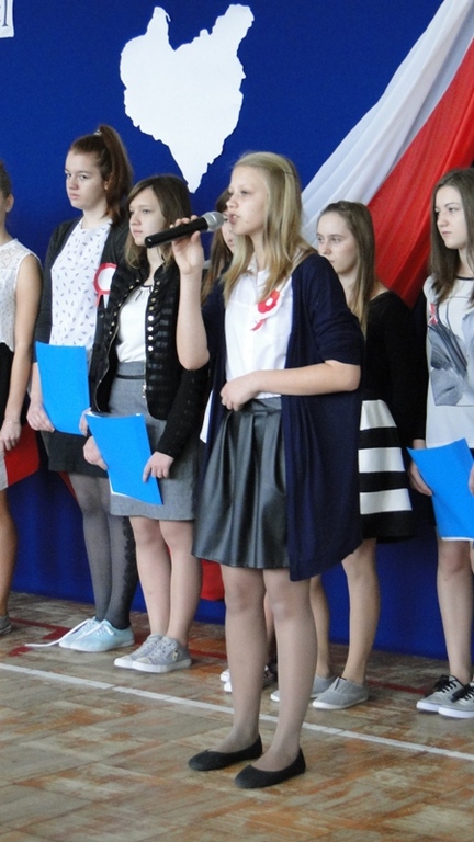 Na tle dekoracji, która nawiązywała do Święta Niepodległości wystąpili uczniowie gimnazjum z przygotowanym pod kierunkiem pana Mariusza Turka programem artystyczny przy wydatnej pomocy pani Igi Ziobro i pana Artura Sułka. Uczniowie z klas II A i III AB zaprezentowali wybrane utwory o tematyce patriotycznej, który przybliżył drogę naszych przodków do wolności w 1918 roku. Całość wzbogaciła muzyka i grupa uczniów pod kierunkiem pani wicedyrektor Justyny Turzyńskiej. Chór szkolny oraz Monika Bolek z kl. III A, która zaśpiewała a cappella pieśń pt. "Rozkwitały pąki białych róż" tak wzruszająco, że proszona była o bis! Na zakończenie programu głos zabrał pan Mariusz Turek, który przypomniał zebranym najważniejsze wydarzenia historyczne i postacie, jakie przyczyniły się do odzyskania niepodległości przez Polskę po 123 latach niewoli, oraz sposoby walki z zaborcami - nauką, pracą i z bronią w ręku.