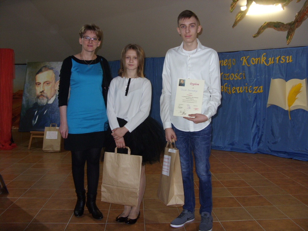 17 marca dwoje uczniów reprezentowało naszą szkołę na uroczystości podsumowania I Gminnego Konkursu o Życiu i Twórczości Henryka Sienkiewicza, która odbyła się w PSP w Bierwcach. II miejsce za pracę pisemną na temat "Moje spotkanie z jednym z bohaterów utworów Henryka Sienkiewicza" zajął Dawid Drewnowski z klasy II gimnazjum. Wyróżnienie za opowiadanie na ten temat otrzymała Oliwia Boryczka z klasy VI. Uczniowie także wzięli udział w spotkaniu z pisarzem i poetą- Henrykiem Morawskim.