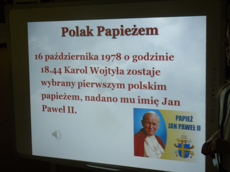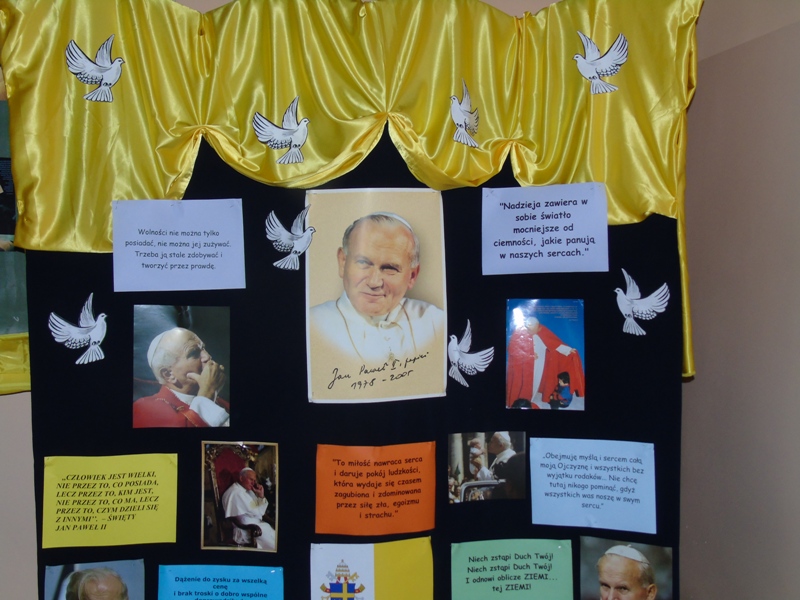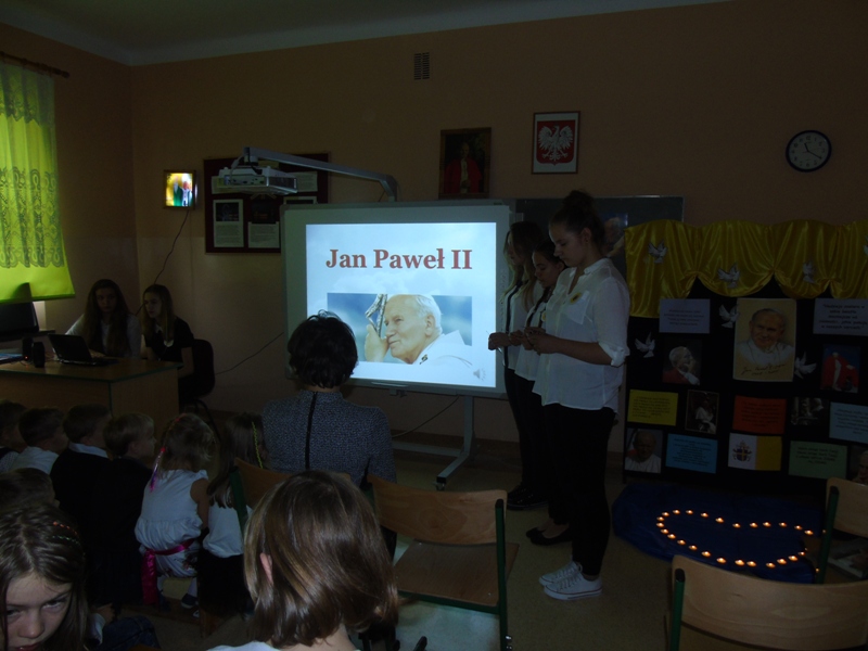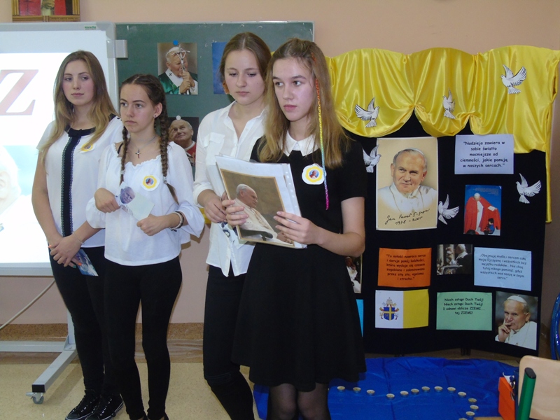 Po raz kolejny w naszej szkole obchodziliśmy ,,Wspomnienie liturgiczne Świętego Jana Pawła II’’. Z tej okazji została przygotowana prezentacja multimedialna przez uczennice z klasy 3 A gimnazjum. Podczas wspólnego spotkania wspominaliśmy postać Papieża Polaka, Jego życie i nauczanie, które pozostawił nam po sobie.