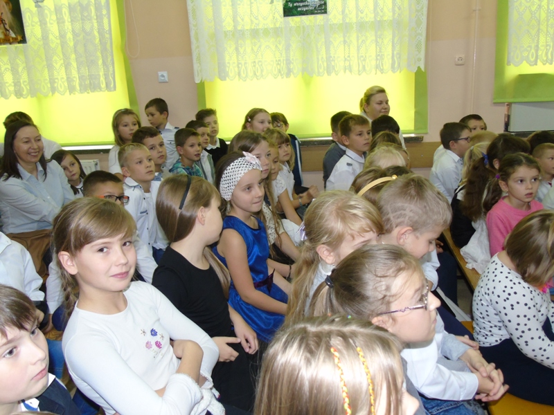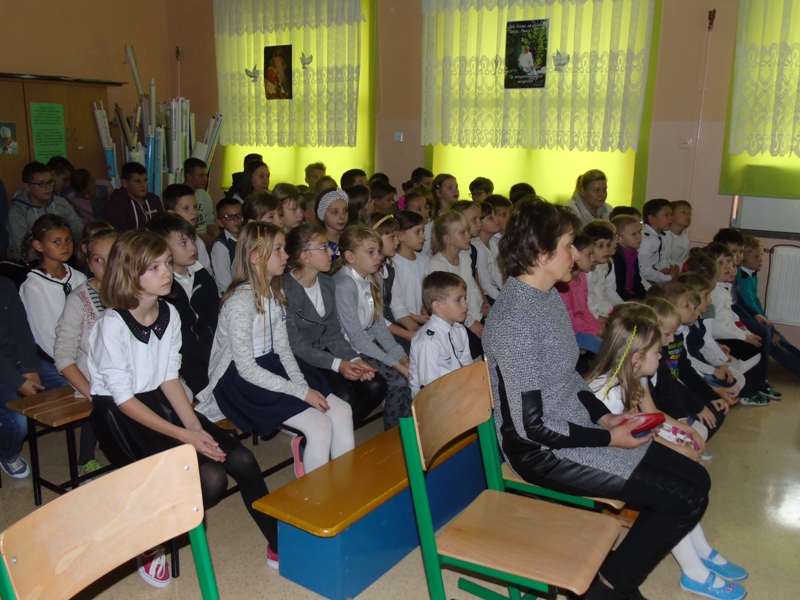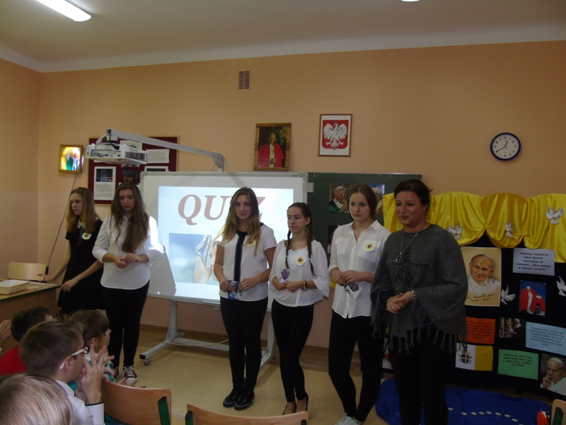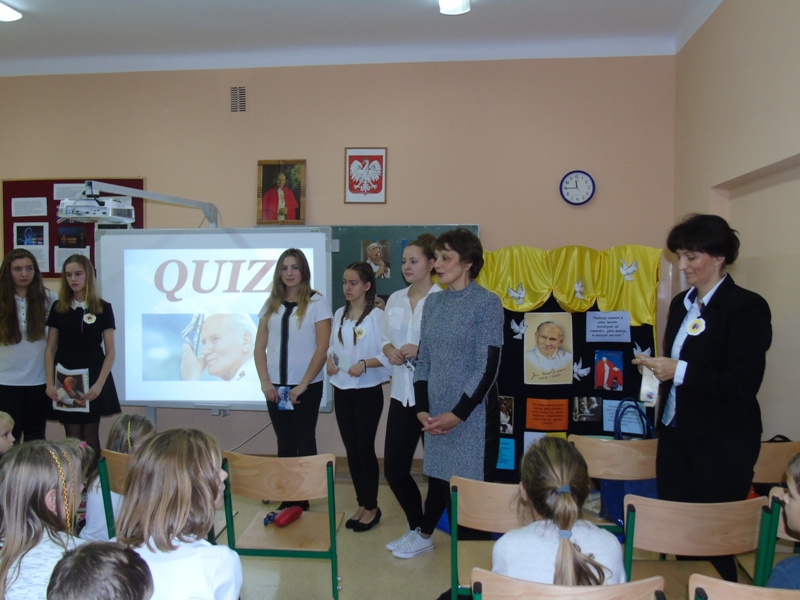 Następnie został przeprowadzony quiz o Janie Pawle II. Za prawidłową odpowiedź uczniowie otrzymywali słodkie batoniki wraz ze złotymi myślami Karola Wojtyły, a dla klas ,,0- 4’’ były pamiątkowe naklejki z postacią Papieża.
