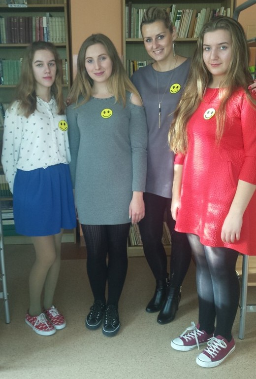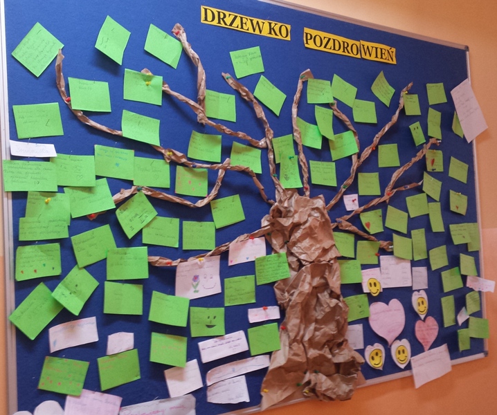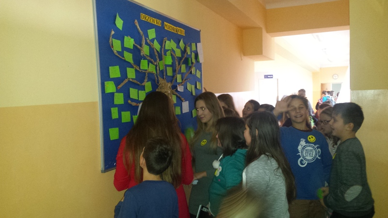 Dnia 18 listopada w naszej szkole promowaliśmy Międzynarodowy Dzień Tolerancji oraz Światowy Dzień Życzliwości i Pozdrowień. Już od samego rana pani Paulina Lasota wraz z uczennicami z Samorządu Uczniowskiego: Pauliną Prygiel, Weroniką Poterą i Aleksandrą Sumińską pracowały nad tym, żeby ubarwić szkołę i poprawić wszystkim humory. Kleiły, malowały i rysowały. Efektem były kartki z cytatami pełnymi życzliwych słów na drzwiach każdej sali, kolorowe plakaty z zasadami tolerancji czy tablica pozdrowień, na której można było przyczepić listki życzliwości z pozdrowieniami kierowanymi do całej społeczności szkolnej lub wybranej osoby. Dodatkowo każdy z uczniów, nauczycieli i pracowników szkoły otrzymał uśmiechniętą buźkę.