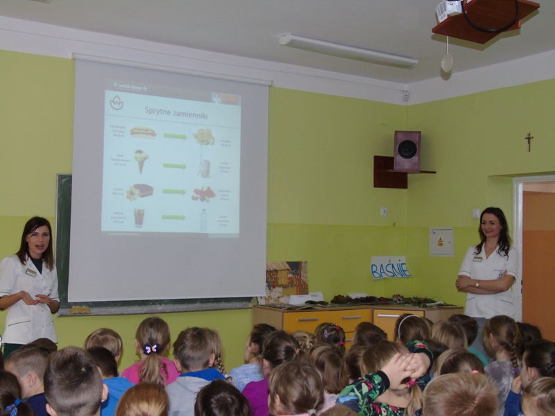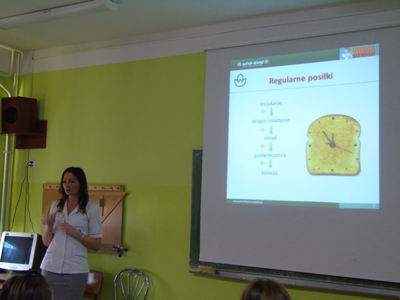 Panie przedstawiły uczniom szkoły podstawowej i gimnazjum prezentację multimedialną na temat zdrowego odżywiania oraz profilaktyki nadwagi i otyłości. Ponadto przekazały ulotki informacyjne na temat produktów żywieniowych oraz diety młodego ucznia. Otrzymaliśmy także zaproszenia na bezpłatną konsultację z dietetykiem, z których mogą skorzystać zainteresowani nauczyciele i rodzice.