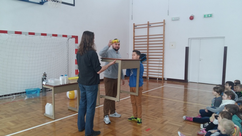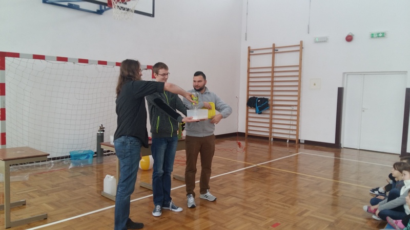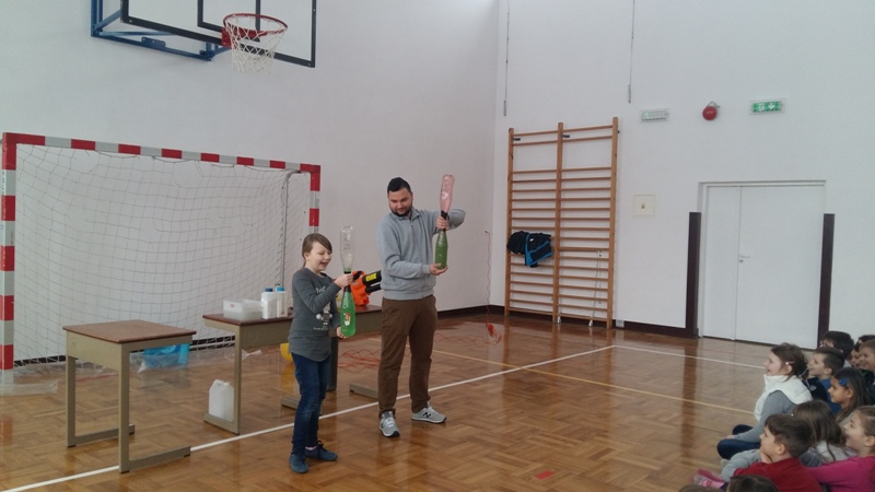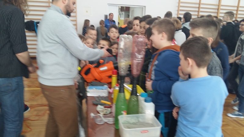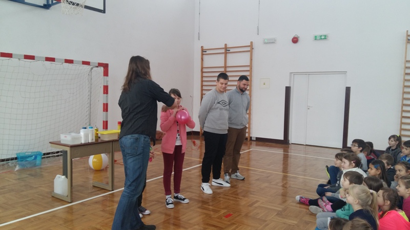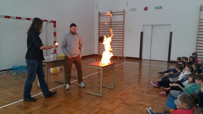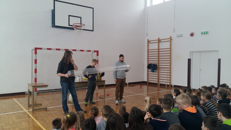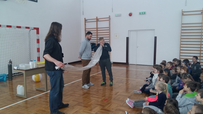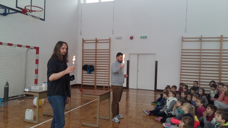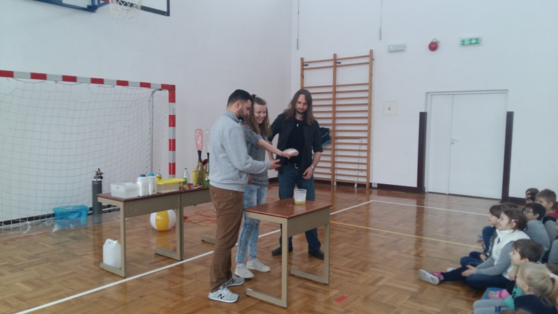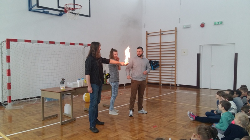 Co nieco o chemii i fizyce w ciekawy i humorystyczny sposób naszym uczniom opowiedzieli członkowie grupy „Zaelektryzowani”. Panowie animatorzy w spotkaniu zatytułowanym „Naukowa epidemia, czary mary i alchemia” zaprezentowali doświadczenia, które przynosiły niezwykłe wzrokowo-słuchowe efekty. Uczniowie byli świadkami wielu eksperymentów, w których też sami mogli uczestniczyć. Pierwsza ochotniczka została poddana próbie ognia. Jej dłoń płonęła, ale pożar nie zostawił na ciele dziewczyny żadnych śladów. Dużą atrakcją były proste eksperymenty chemiczne, takie jak wytwarzanie domowym sposobem wodoru i dwutlenku węgla. Przy okazji wszyscy poznali ich najważniejsze właściwości. Mamy nadzieję, że dzięki tej żywej lekcji przyrody niejeden uczeń odkryje w sobie żyłkę naukowca.