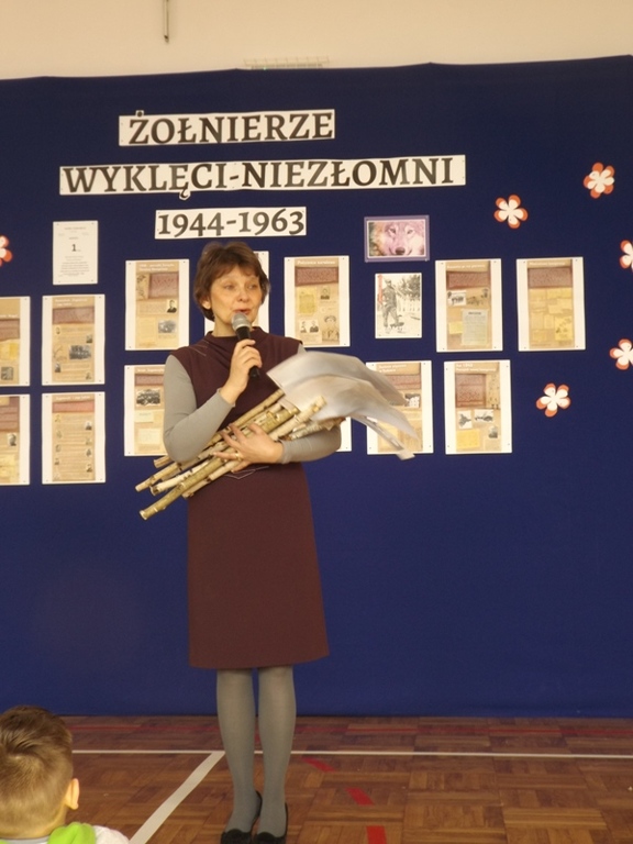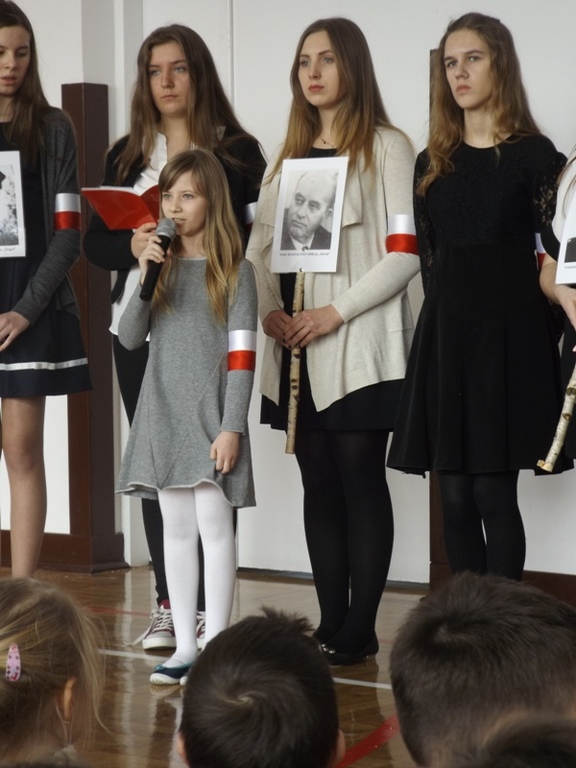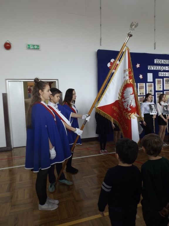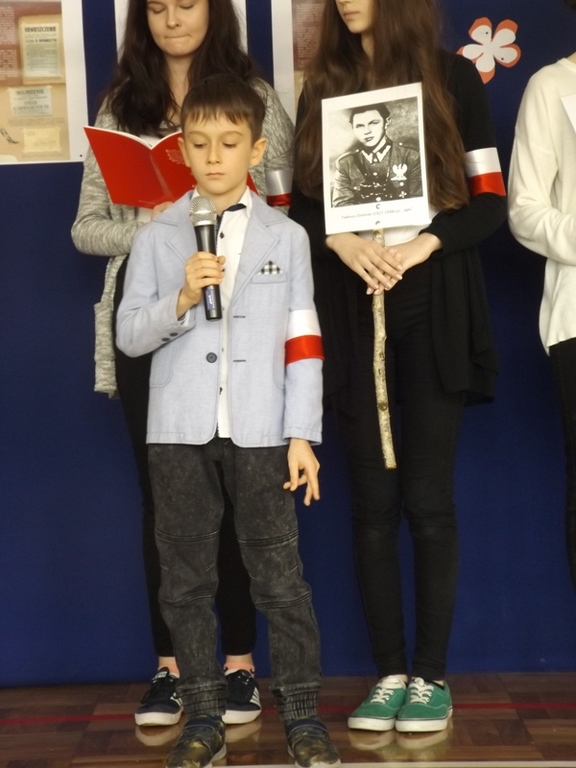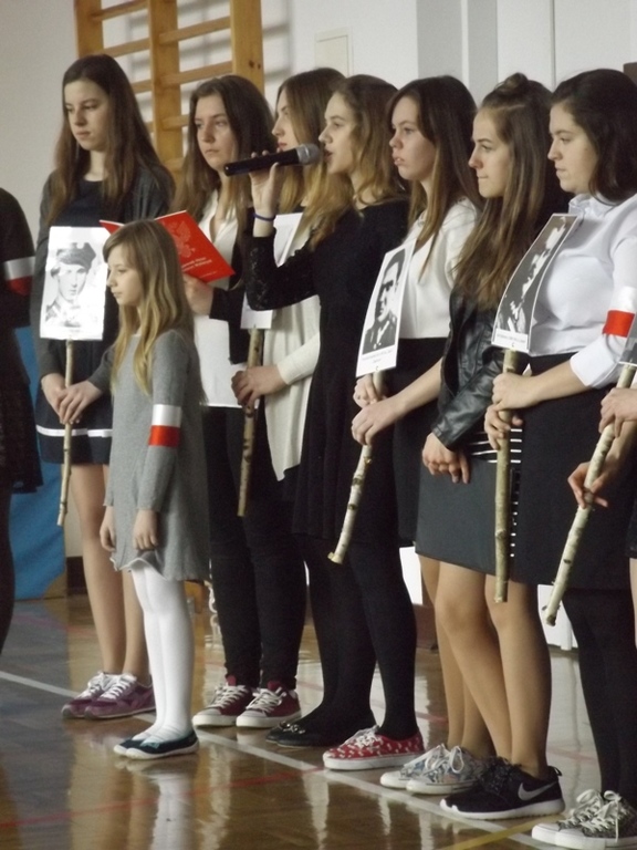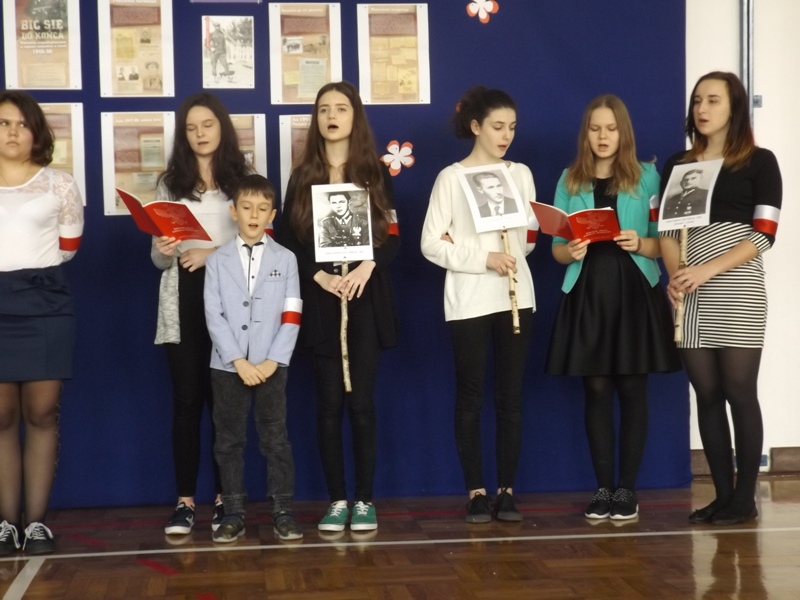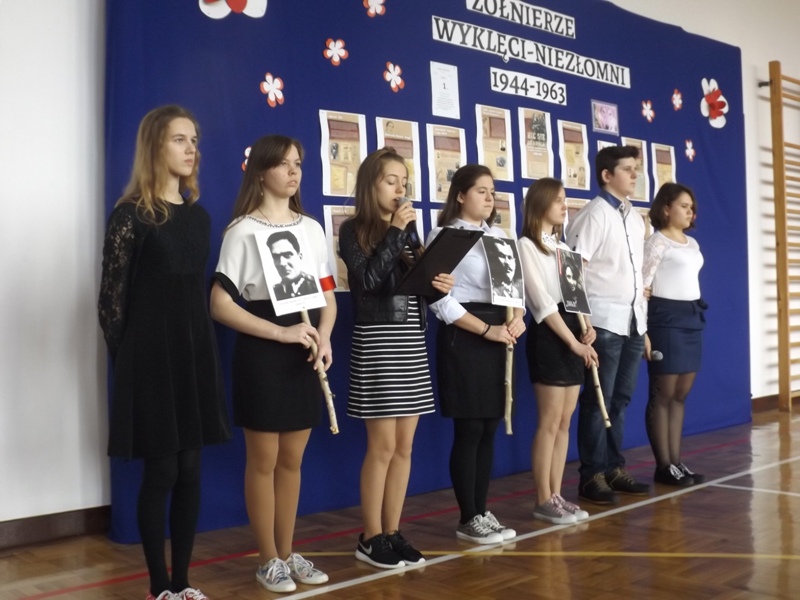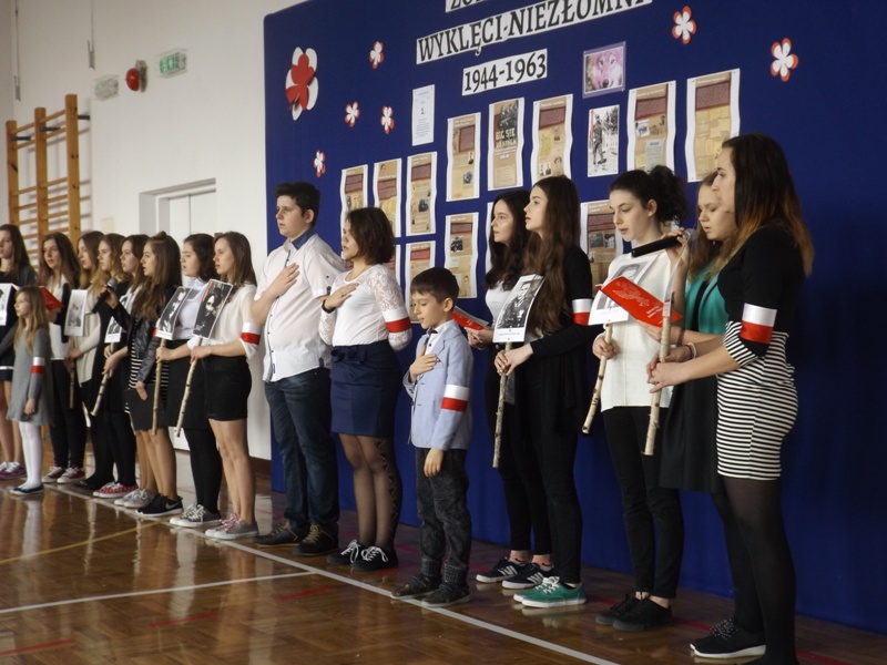 We czwartek 2 marca 2017r. uczniowie gimnazjum pod kierunkiem nauczycieli w formie montażu słowno-muzycznego „Rzeczypospolitej poprzysięgali!” zaprezentowali postaci Żołnierzy Wyklętych. Akademia rozpoczęła się od uroczystego odśpiewania hymnu państwowego w asyście pocztu sztandarowego. Następnie Julia Czajka odczytała krótkie informacje dotyczące Bohaterów Niezłomnych Ziemi Radomskiej, szczególnie bliskie sercu Pani Dyrektor Doroty Dobosz, ponieważ wśród nich był wspomniany Jej dziadek. Portrety, przepięknie wyrecytowane wiersze i muzyczna oprawa przybliżyły uczestnikom klimat tamtych wydarzeń. W sposób ciekawy i przejmujący udało im się pokazać historię Inki i Żołnierzy Wyklętych oraz udowodnić, że należy im się zacne miejsce w Panteonie Narodowych Bohaterów. Na koniec głos zabrała Pani Dyrektor Dorota Dobosz, która wyraziła nadzieję, że uczniowie zawsze będą potrafili „zachować się jak trzeba”, jak to uczynili Bohaterowie Niezłomni.