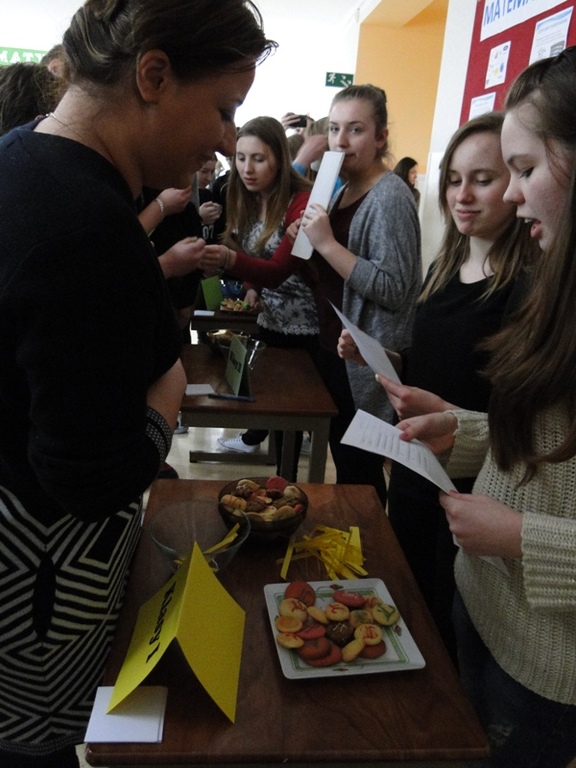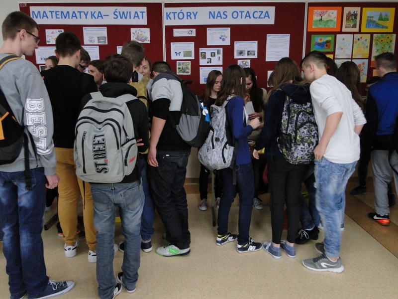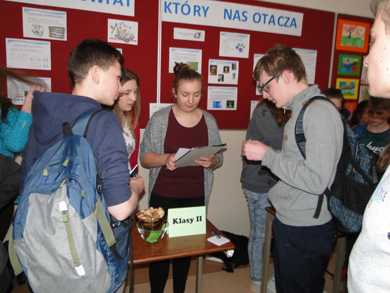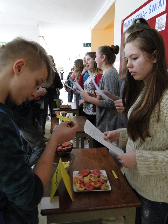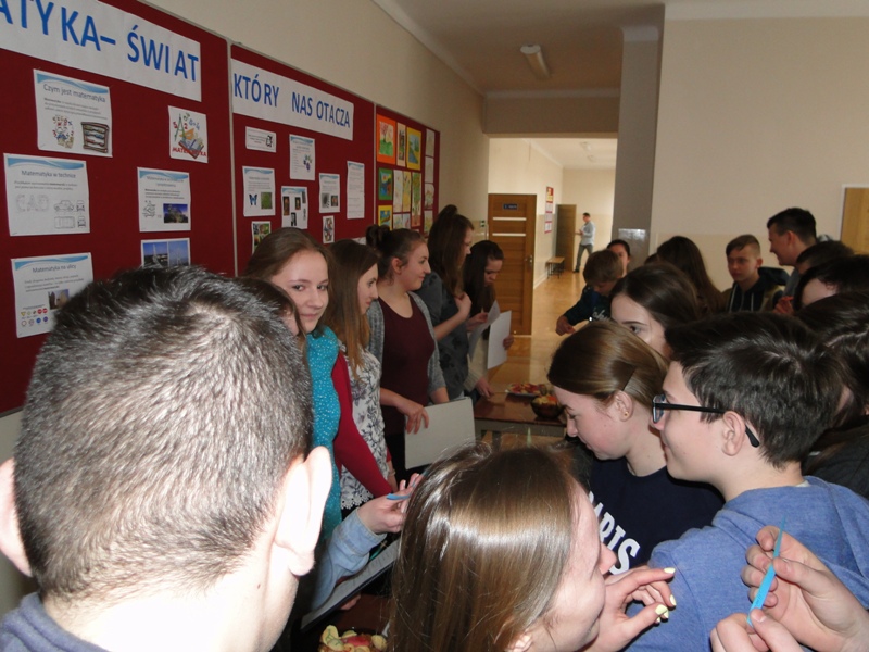Na długiej przerwie uczniowie gimnazjum mieli okazję sprawdzić swoje umiejętności matematyczne w konkursie krótkich pytań. Na każdą klasę czekał osobny stolik z pytaniami. Wszyscy gimnazjaliści, którzy przystąpili do konkursu otrzymali pyszną niespodziankę – ciasteczko z liczbą π, upieczone przez uczennice z klasy IIIA. Konkurs podobał się uczniom, o czym świadczyły tłumy gimnazjalistów przy stolikach. Wielu z nich kilkakrotnie podchodziło do losowania pytań.