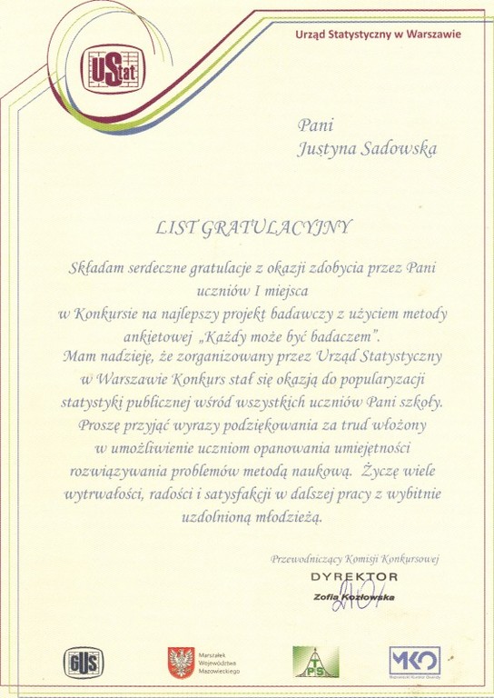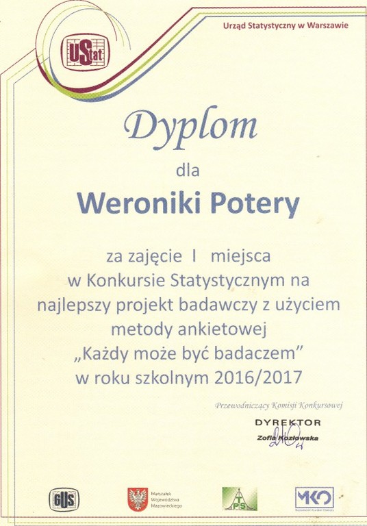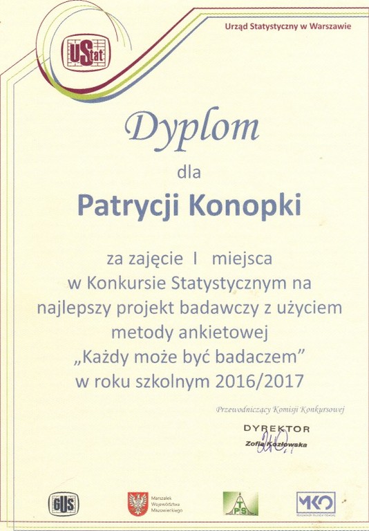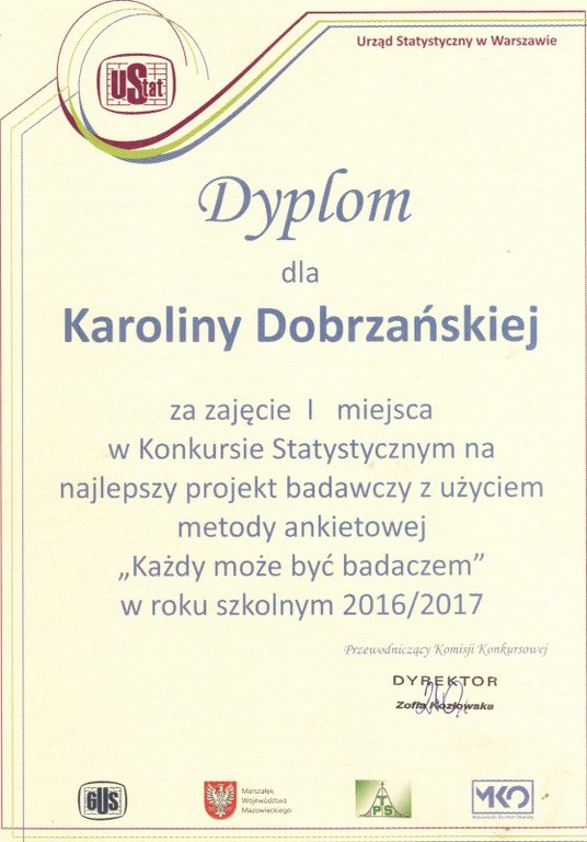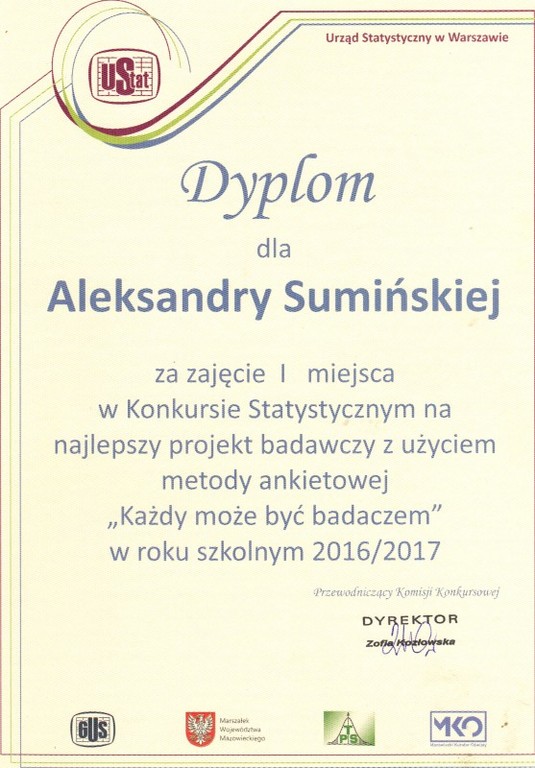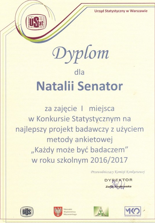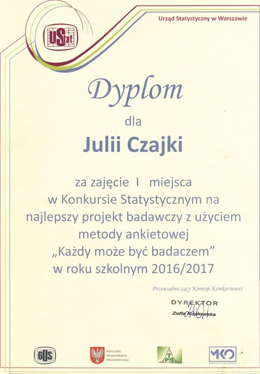 7 czerwca uczennice klasy IIIA: Weronika Potera, Paulina Prygiel, Aleksandra Sumińska, Patrycja Konopka, Karolina Dobrzańska, Julia Czajka i Natalia Senator wraz z opiekunem p. Justyną Sadowską uczestniczyły w uroczystym wręczeniu nagród wojewódzkiego konkursu statystycznego ,,Każdy może być badaczem”. Na uroczystości obecni byli: p. Agnieszka Ajdyn i p. Krzysztof Kowalski – zastępcy dyrektora Urzędu Statystycznego w Warszawie, p. Włodzimierz Okrasa – wiceprezes Polskiego Towarzystwa Statystycznego oraz p. Tomasz Kalbarczyk – koordynator konkursu.
