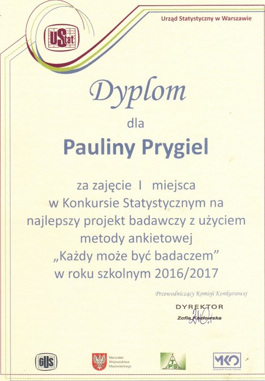 Nasze dziewczęta zajęły w konkursie I miejsce. Nagrodą główną dla każdej laureatki był Power Bank z pamięcią USB 32GB. Nagrodami dodatkowymi były zestawy gadżetów (np. linijki z kalkulatorem, piórniki z wyposażeniem, długopisy, notesy, odblaski czy publikacje Głównego Urzędu Statystycznego).