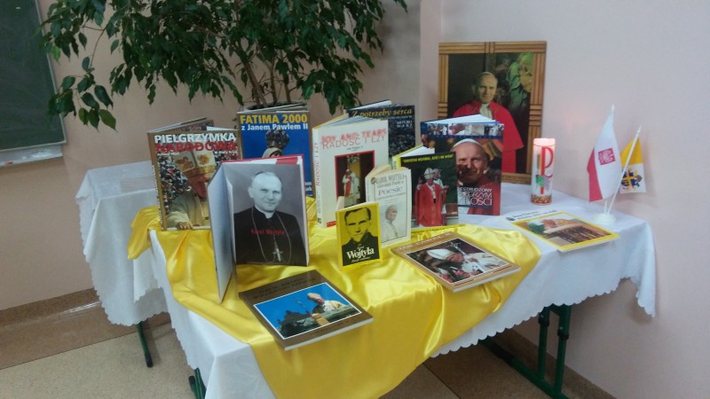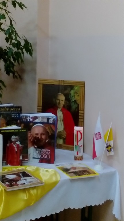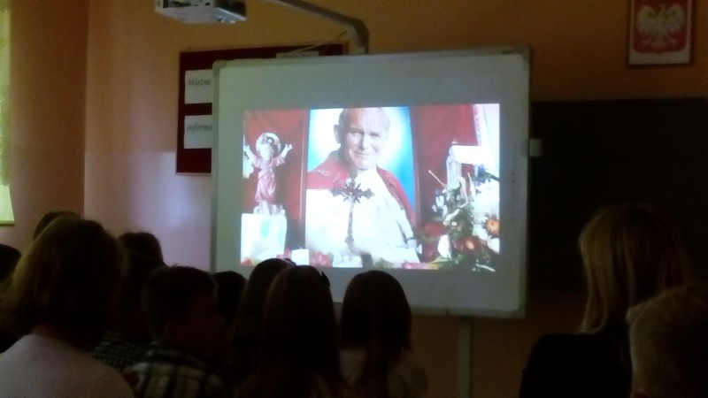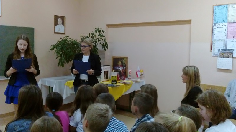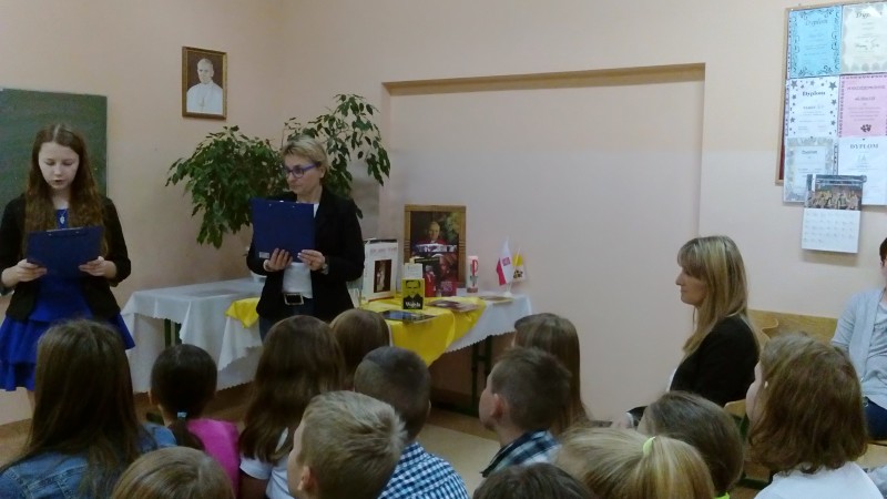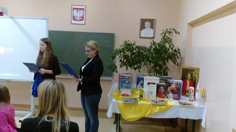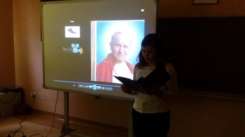 Uczennica klasy II A Kowalczyk Angelika powitała zebranych. W dalszej części wysłuchaliśmy wierszy Jana Pawła II w języku polskim