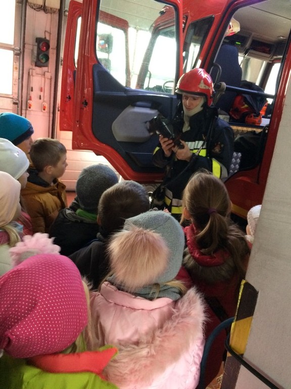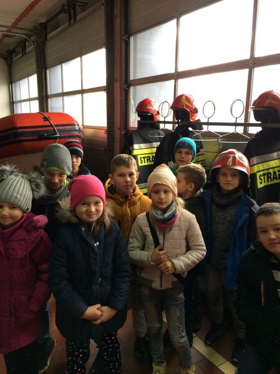Dnia 30 października dzieci z oddziału przedszkolnego oraz z klasy 1-3 miały przyjemność zobaczyć z bliska, jak wygląda praca strażaków. Zwiedziły budynek, dowiedziały się wielu informacji dotyczących pracy strażaka, wysłuchały informacji, którymi pojazdami strażacy wyjeżdżają do wypadków, a jakimi gaszą pożary. Obejrzały również wyposażenie pojazdów oraz niezbędne do pracy urządzenia. Mogły przymierzyć hełm strażacki oraz zobaczyć, jak strażak w razie alarmu zjeżdża z rury. Po takiej wycieczce wszystkie dzieci zgodnie przyznały, że ten zawód bardzo im się podoba, a niejedno dziecko w przyszłości chciałoby zostać strażakiem. Spotkanie to uświadomiło dzieciom, jak trudna i odpowiedzialna, a zarazem ciekawa, jest praca strażaka.