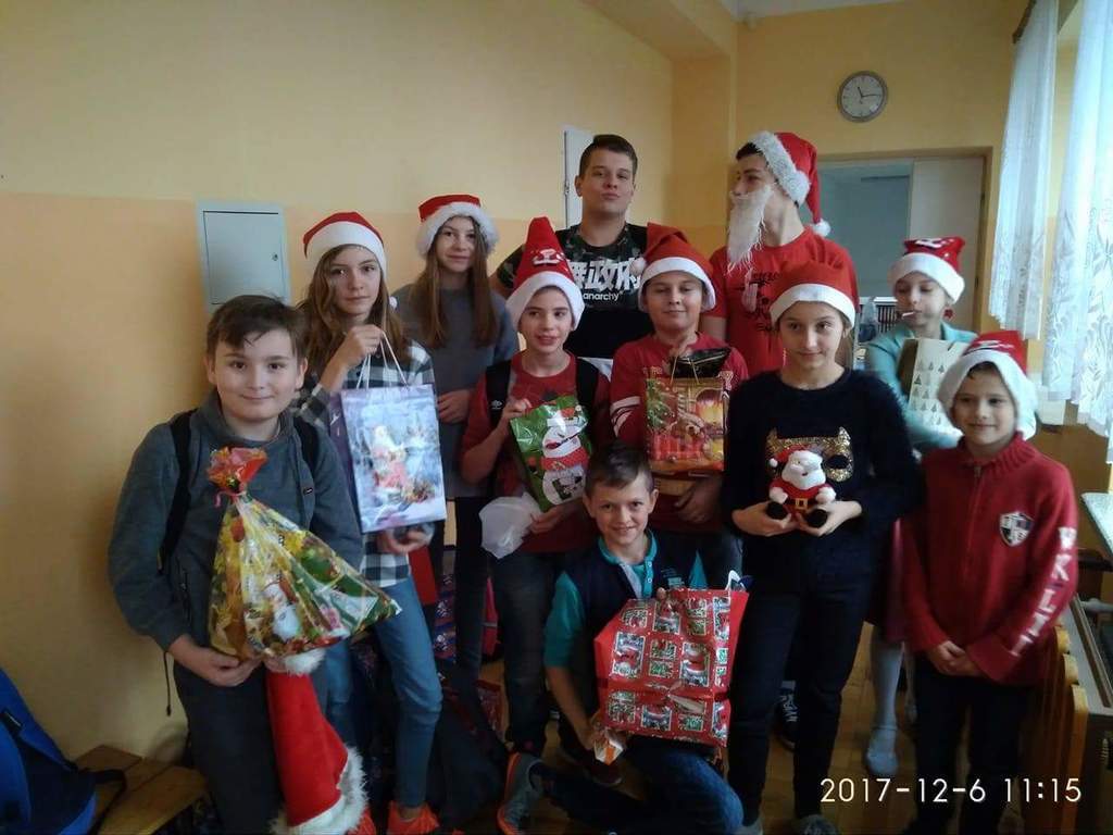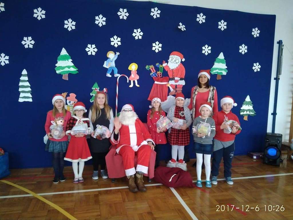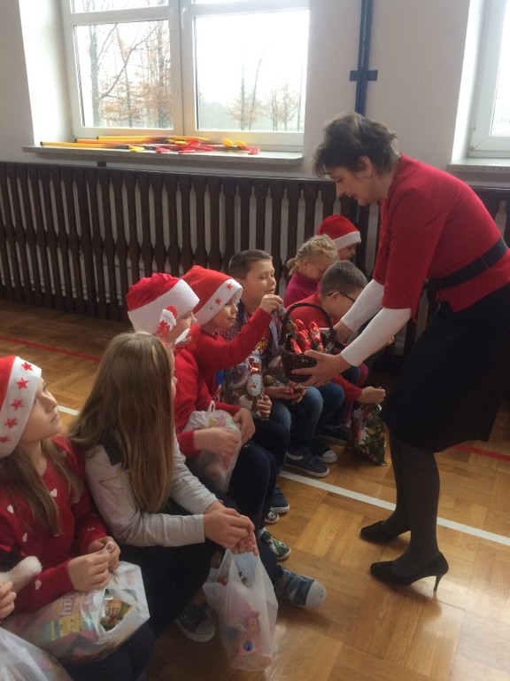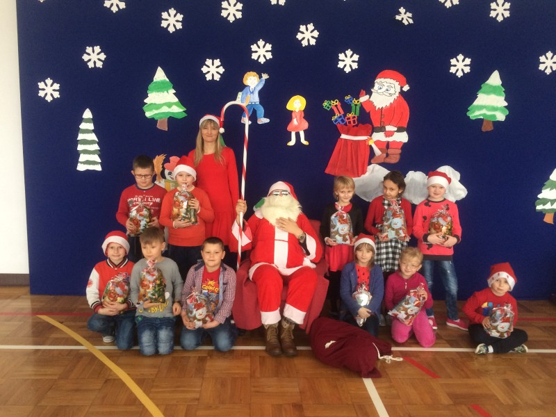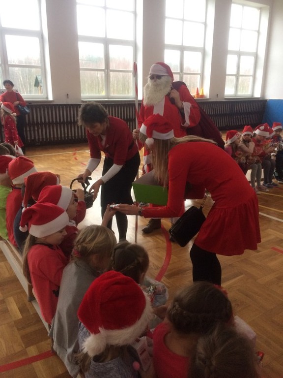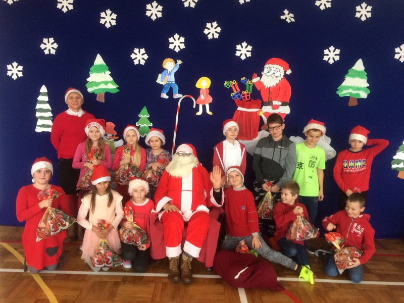 6 grudnia od samego rana korytarze i klasy wypełniły się uczniami, nauczycielami i pracownikami ubranymi na czerwono. W tym dniu bowiem naszą szkołę odwiedził Mikołaj. Niezwykły gość wraz z pomocnikami, czyli panią dyrektor Dorotą Dobosz i wicedyrektor Patrycją Wieczorek, obdarował dzieci i młodzież łakociami, a oni odpłacili się ślicznymi uśmiechami, piosenkami i wierszykami. Wszyscy obiecali, że będą grzeczni i postarają się nie sprawiać kłopotu swoim rodzicom ani nauczycielom. Był to naprawdę udany i niezapomniany dzień, który wprowadził nas w świąteczny nastrój. Czekamy już z niecierpliwością na przybycie Mikołaja w następnym roku.