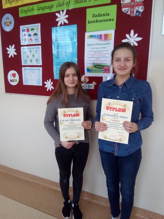 Kolejna edycja konkursu matematycznego w języku angielskim dobiegła końca. Wyłoniliśmy zwycięzców. W kategorii klas VI-VII szkoły podstawowej wygrała Aleksandra Kobza z klasy VII. W kategorii klas gimnazjalnych największą ilość punktów zdobyła Oliwia Boryczka z klasy IIB.