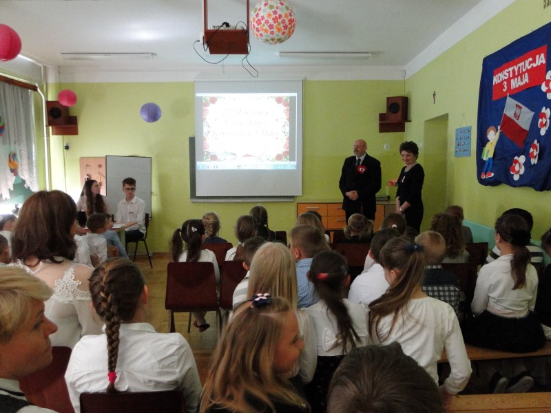 Cała społeczność szkolna uczciła Konstytucję 3 Maja odświętnym ubiorem oraz uczestnictwem pokazie multimedialnym, który utrzymany został w podniosłym nastroju. Pokaz przygotował i opatrzył komentarzem Pan Mariusz Turek, którego wspierali lektorzy z klasy II A gimnazjum: Karolina Zabielska, Kinga Rychel i Jakub Prygiel.