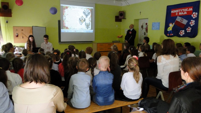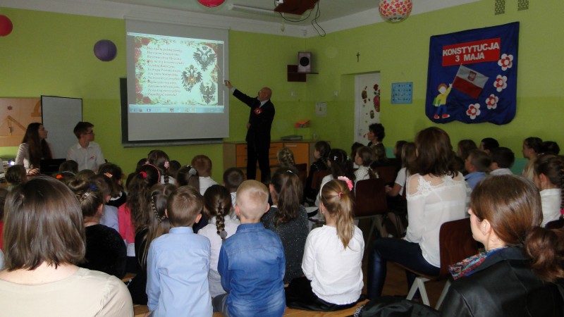 27 kwietnia 2018 roku w obecności Pani Dyrektor Doroty Dobosz i Pani Wicedyrektor Patrycji Wieczorek, dzieci i młodzież Publicznej Szkoły Podstawowej i gimnazjaliści uczcili pamięć 227 rocznicy uchwalenia niezwykłego aktu prawnego, jakim była ówczesna Konstytucja z 1791 roku. (Pierwsza w Europie i druga na świecie, po amerykańskiej). Wprowadzała doniosłe zmiany w życiu politycznym i społecznym w naszej ojczyźnie. 11 rozdziałów tej Ustawy Zasadniczej gwarantować miało naprawę Rzeczypospolitej w duchu oświeceniowym. Po raz pierwszy obowiązywać miał trójpodział władzy na Ustawodawczą, Wykonawczą i Sądowniczą. Zastosowanie jej zapisów dawało szansę naszym przodkom na pełne uniezależnienie się od wrogów i zaborców: Rosji, Austrii i Prus. Byt Konstytucji był krótki, bo ledwie półtoraroczny. Zakończył się wojną w jej obronie i drugim, oraz po Insurekcji Kościuszki, trzecim rozbiorem Polski, które definitywnie przekreśliły nasz suwerenny byt na 123 lata.