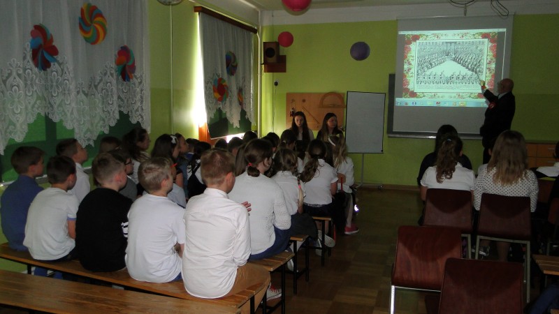 Po obejrzeniu obrazów przedstawiających dzieje Konstytucji, wspólnie odśpiewaliśmy „Mazurka Dąbrowskiego” i wysłuchaliśmy „Poloneza 3 Maja” oraz poloneza „Pożegnanie Ojczyzny” M. K. Ogińskiego. Całość programu odbyła się we współpracy z odpowiedzialną za dekoracje i fotografie Panią Igą Ziobro.