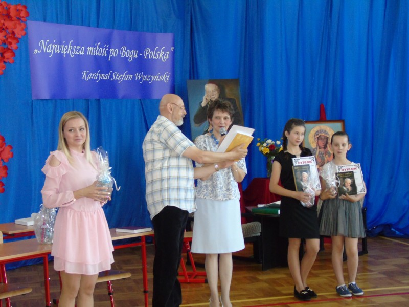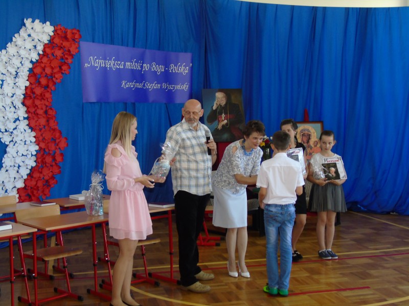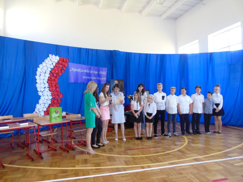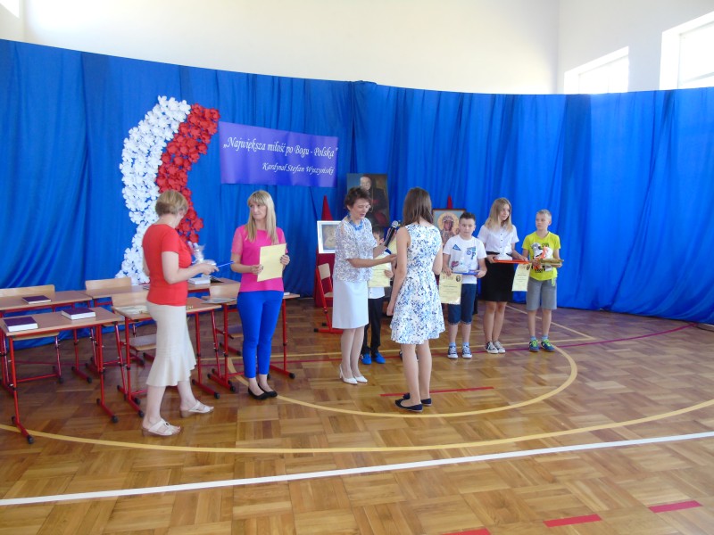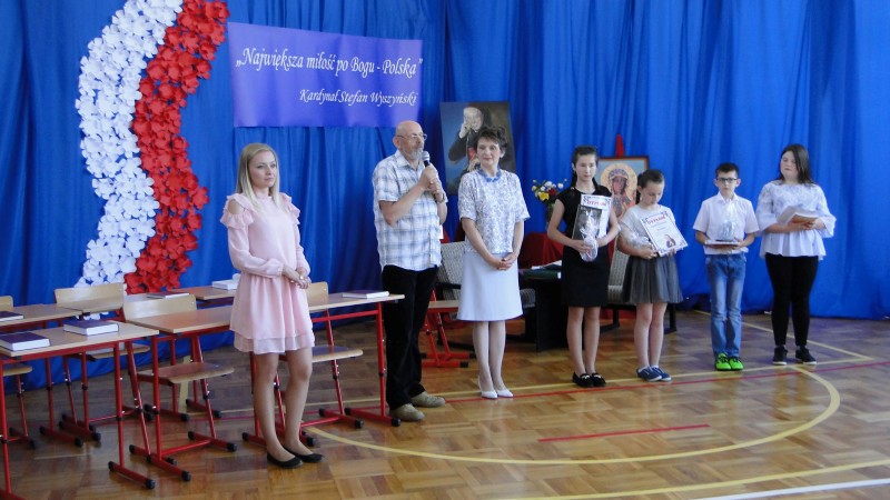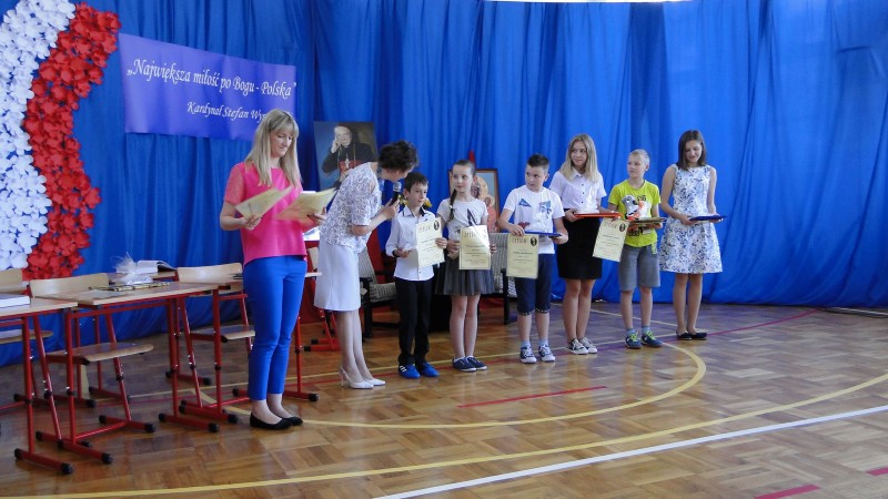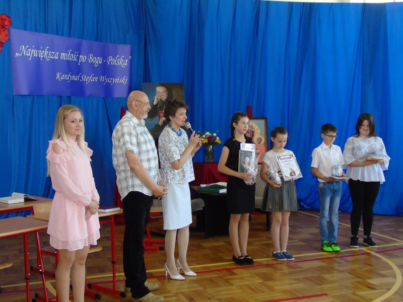 Uczniowie z niecierpliwością czekali na ostatni dzień maja, kiedy to w naszej szkole odbyła się uroczystość podsumowania konkursów przeprowadzonych z okazji 10. Rocznicy Nadania Szkole Imienia Kardynała Stefana Wyszyńskiego. W tym dniu miło nam było gościć laureatów konkursów gminnych, którzy przybyli z opiekunami. Pani Dyrektor Dorota Dobosz wręczyła dyplomy zwycięzcom oraz podziękowania nauczycielom, gratulując osiągniętych wyników i życząc sukcesów.