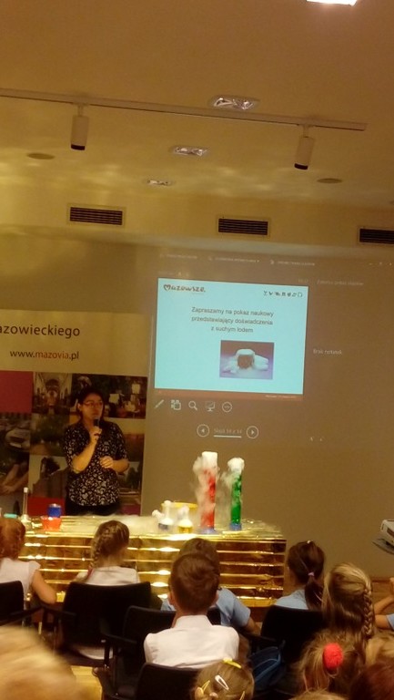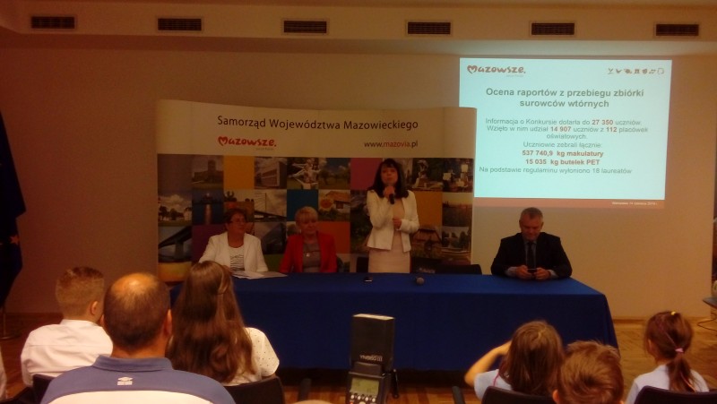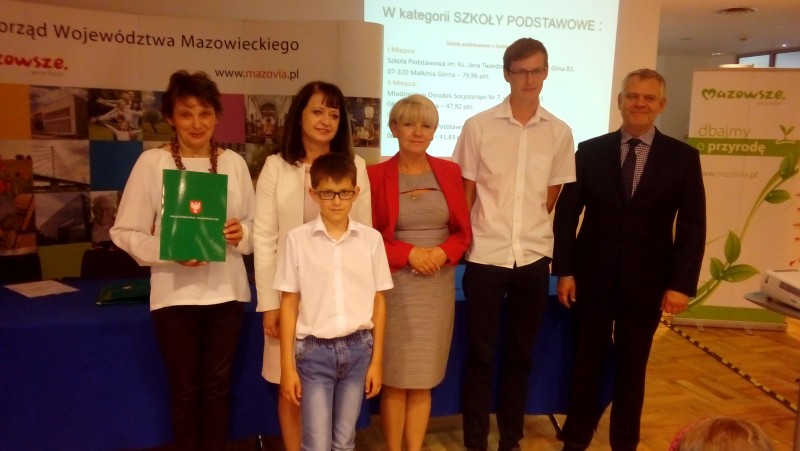 Dnia 14.06.2018 w warszawskim Urzędzie Marszałkowskim w departamencie Ochrony Środowiska odbyło się podsumowanie corocznego konkursu zbiórki makulatury oraz surowców wtórnych. Na tę uroczystość udała się Pani Dyrektor Dorota Dobosz wraz przedstawicielami uczniów naszej szkoły. W obecnym roku szkolnym nasza placówka zajęła II miejsce w kategorii szkół do 200 uczniów. Po wręczeniu dyplomów odbył się pokaz doświadczeń fizycznych i chemicznych, następnie poczęstunek, po którym Pani Dyrektor odebrała nagrody.