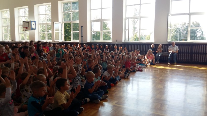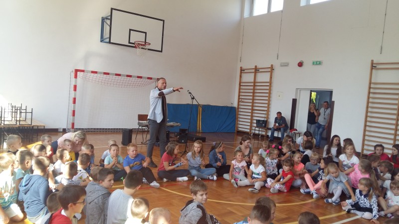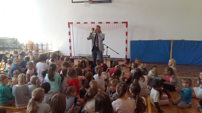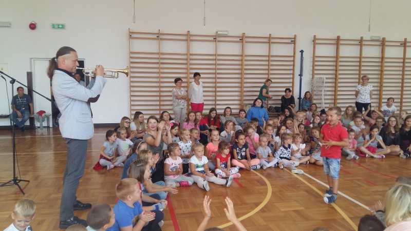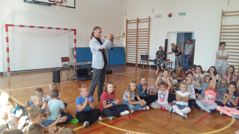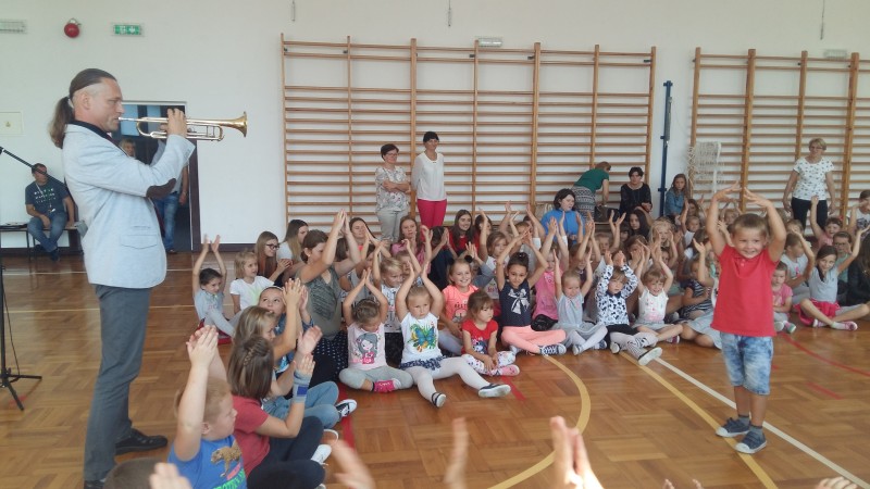 W piątek 21 września kolejny raz naszą szkołę odwiedził pan Marcin Jóźwik - założyciel Podróżującej Filharmonii. Tym razem artysta zaproponował nam muzykę patriotyczną oraz znane melodie filmowe. Oprócz fragmentów pięknej symfonii, dźwięków skrzypiec i trąbki były wspólne ćwiczenia rytmiczne. Bawili się wszyscy - młodsi i starsi uczniowie. Program inspirowany był metodami wychowawczymi Carla Orffa oraz Weroniki Sherborne. Terapeutyczna i integracyjna zabawa została nagrodzona gromkimi brawami.