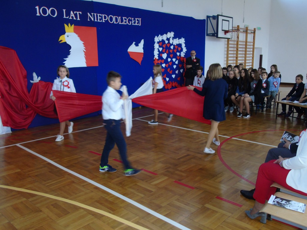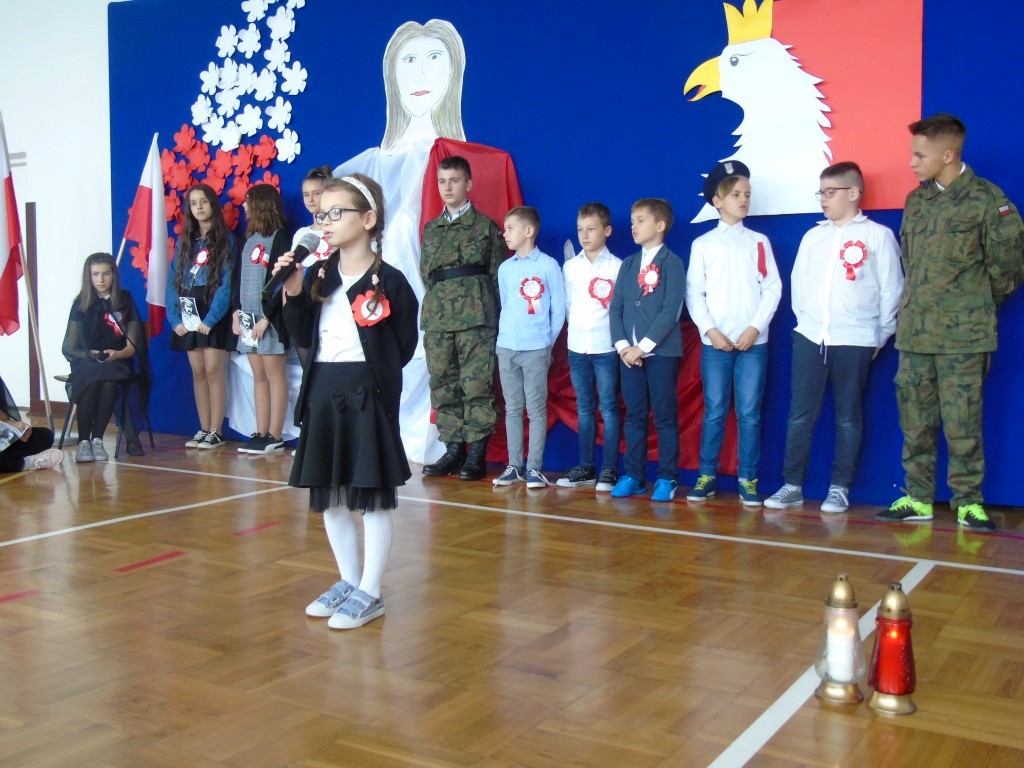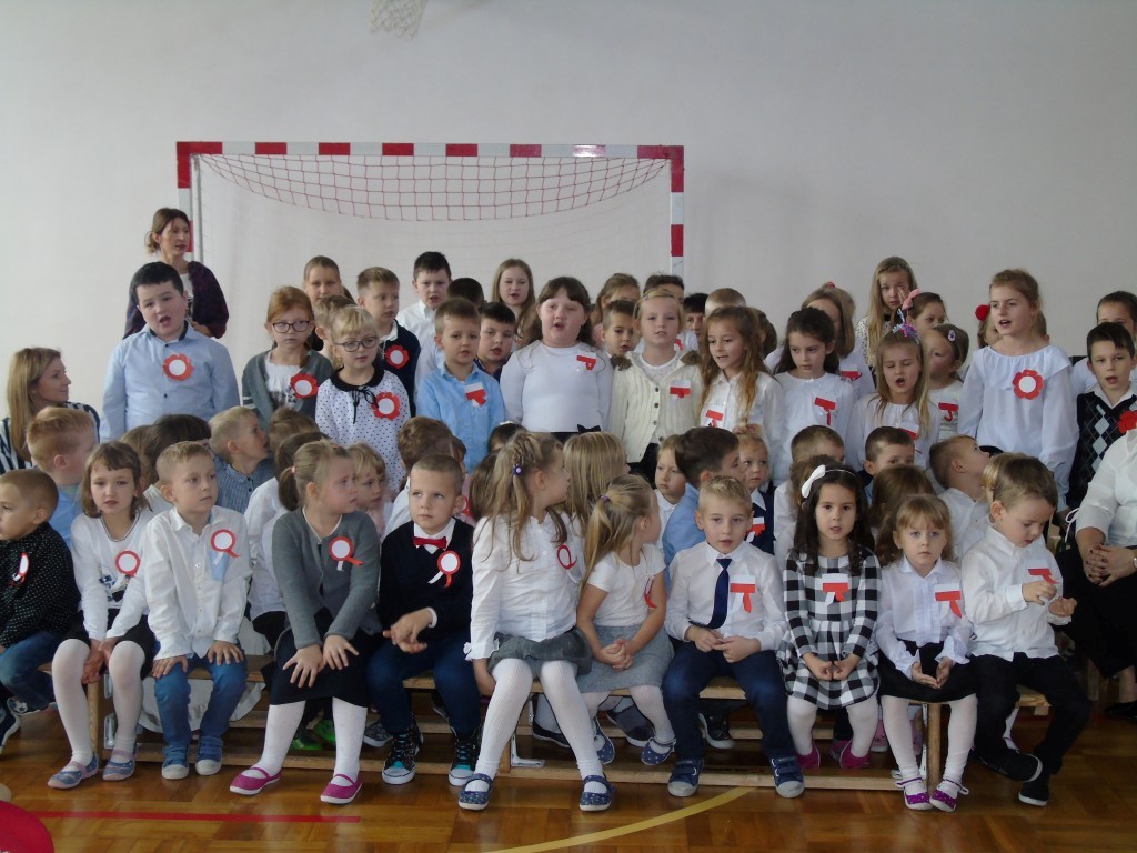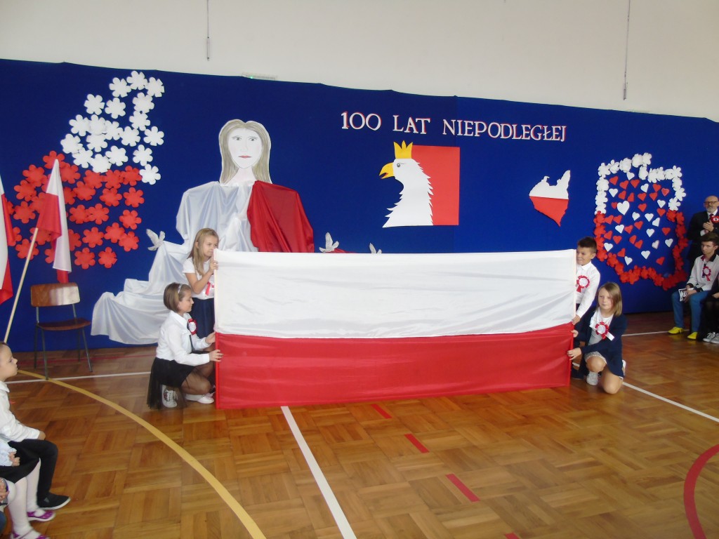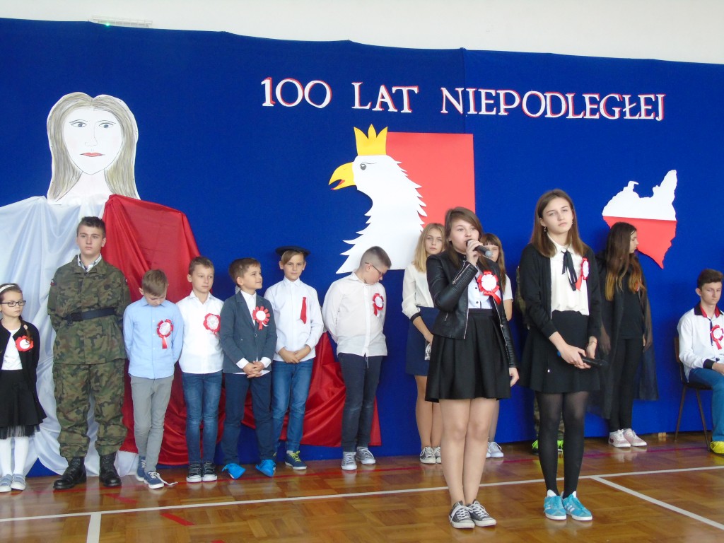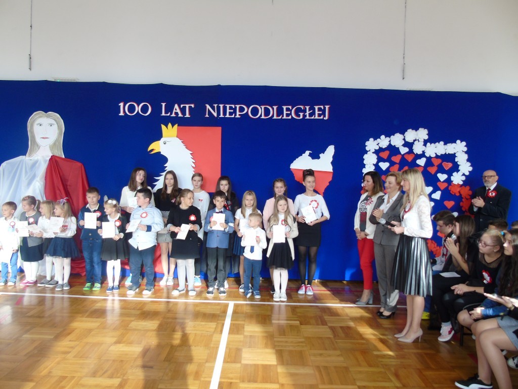 9 listopada 2018r. odbyła się akademia z okazji 100. rocznicy odzyskania niepodległości przez Polskę, uroczystość poświęcona ojczyźnie i wolności. Swoją obecnością zaszczycili nas zaproszeni goście: Pan Marcin Drewnowski – Przewodniczący Rady Gminy, Pani Agnieszka Gryzek – Dyrektor GCKiKF, Pani Edyta Kozak – Wiceprezes Stowarzyszenia „Czas na zmiany”, Zarząd Rady Rodziców: Pani Joanna Sułkowska, Pani Anna Gołębiowska, Pani Lidia Murawska, a także rodzice. O godzinie 11.11 cała społeczność szkolna oraz goście zaśpiewali cztery zwrotki hymnu państwowego, włączając się do akcji „Rekord dla Nieodległej”. Następnie uczniowie zaprezentowali przedstawienie ukazujące drogi do niepodległości, okraszone tańcem oraz śpiewem pieśni patriotycznych. Wspólne śpiewanie to hołd, jaki został złożony tym, którzy w wielkim trudzie i poświęceniu wywalczyli przed laty wymarzoną niepodległość. To także nasza radość, że mamy dziś wolną Polskę.
