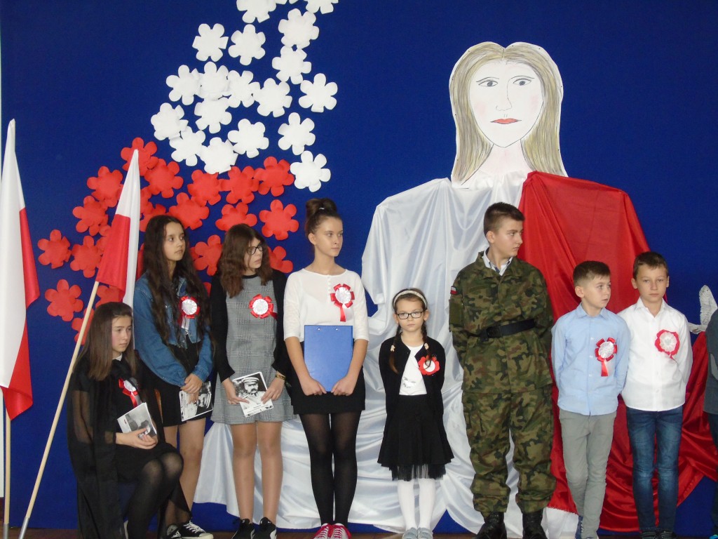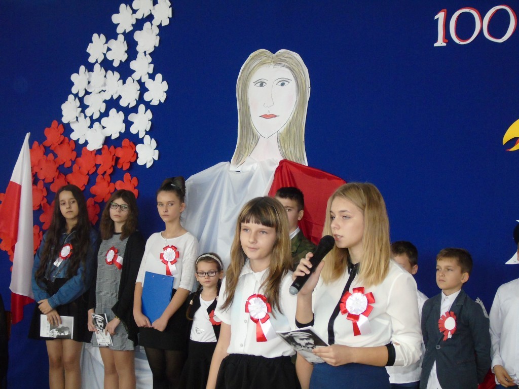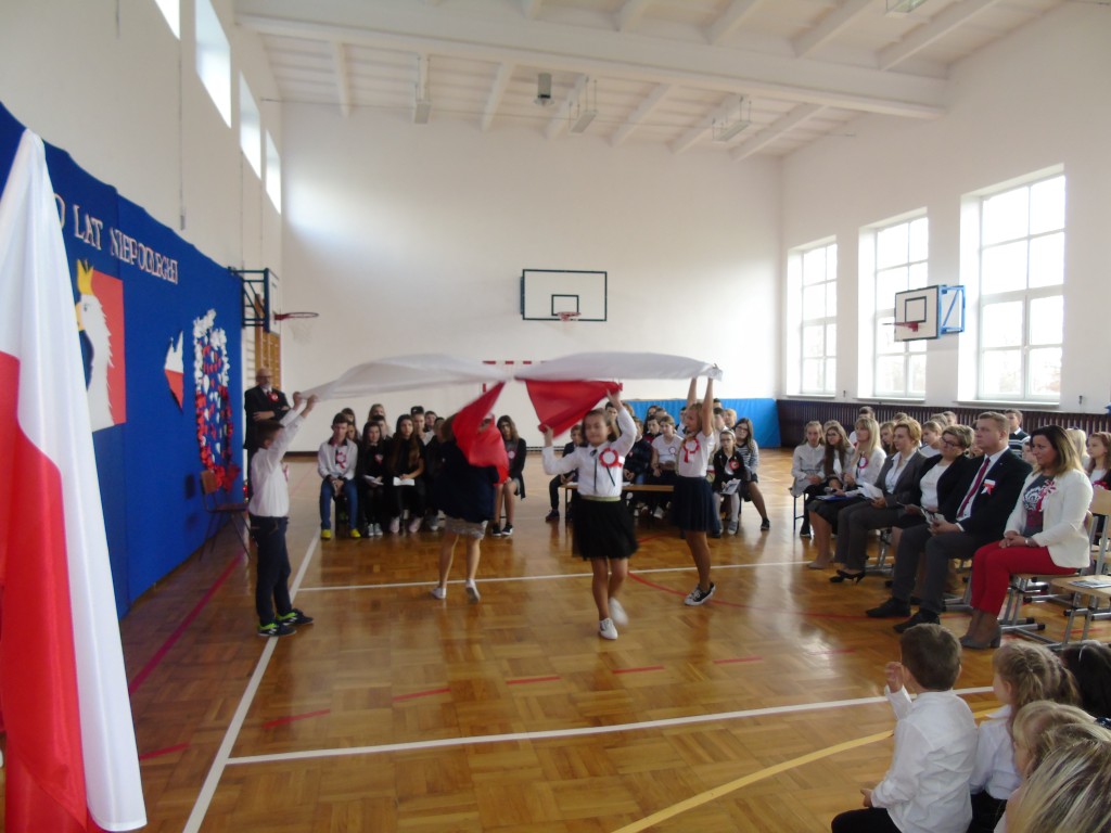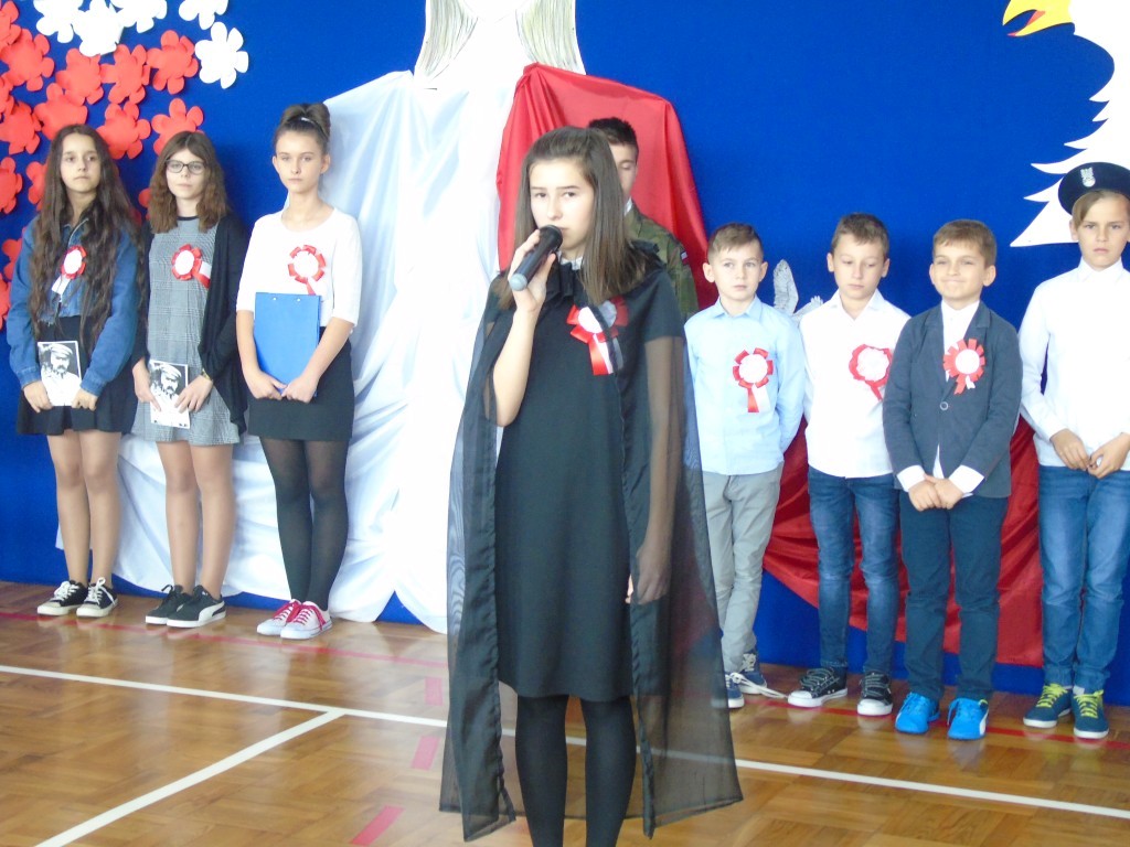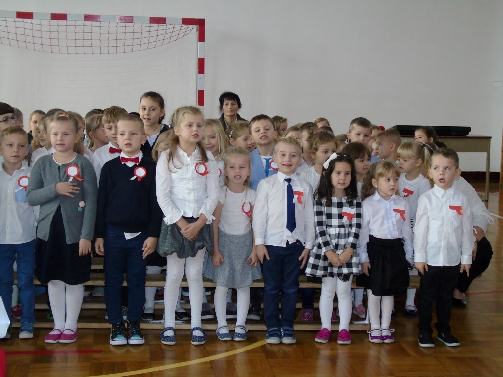 9 listopada 2018r. odbyła się akademia z okazji 100. rocznicy odzyskania niepodległości przez Polskę, uroczystość poświęcona ojczyźnie i wolności. Swoją obecnością zaszczycili nas zaproszeni goście: Pan Marcin Drewnowski – Przewodniczący Rady Gminy, Pani Agnieszka Gryzek – Dyrektor GCKiKF, Pani Edyta Kozak – Wiceprezes Stowarzyszenia „Czas na zmiany”, Zarząd Rady Rodziców: Pani Joanna Sułkowska, Pani Anna Gołębiowska, Pani Lidia Murawska, a także rodzice. O godzinie 11.11 cała społeczność szkolna oraz goście zaśpiewali cztery zwrotki hymnu państwowego, włączając się do akcji „Rekord dla Nieodległej”. Następnie uczniowie zaprezentowali przedstawienie ukazujące drogi do niepodległości, okraszone tańcem oraz śpiewem pieśni patriotycznych. Wspólne śpiewanie to hołd, jaki został złożony tym, którzy w wielkim trudzie i poświęceniu wywalczyli przed laty wymarzoną niepodległość. To także nasza radość, że mamy dziś wolną Polskę.