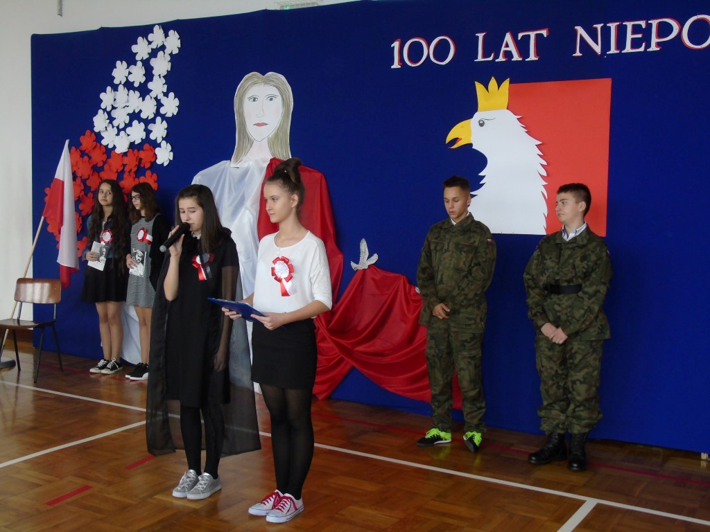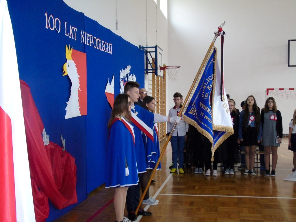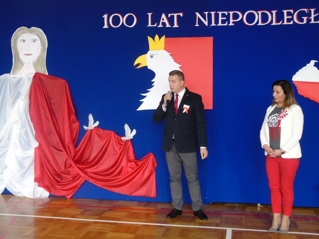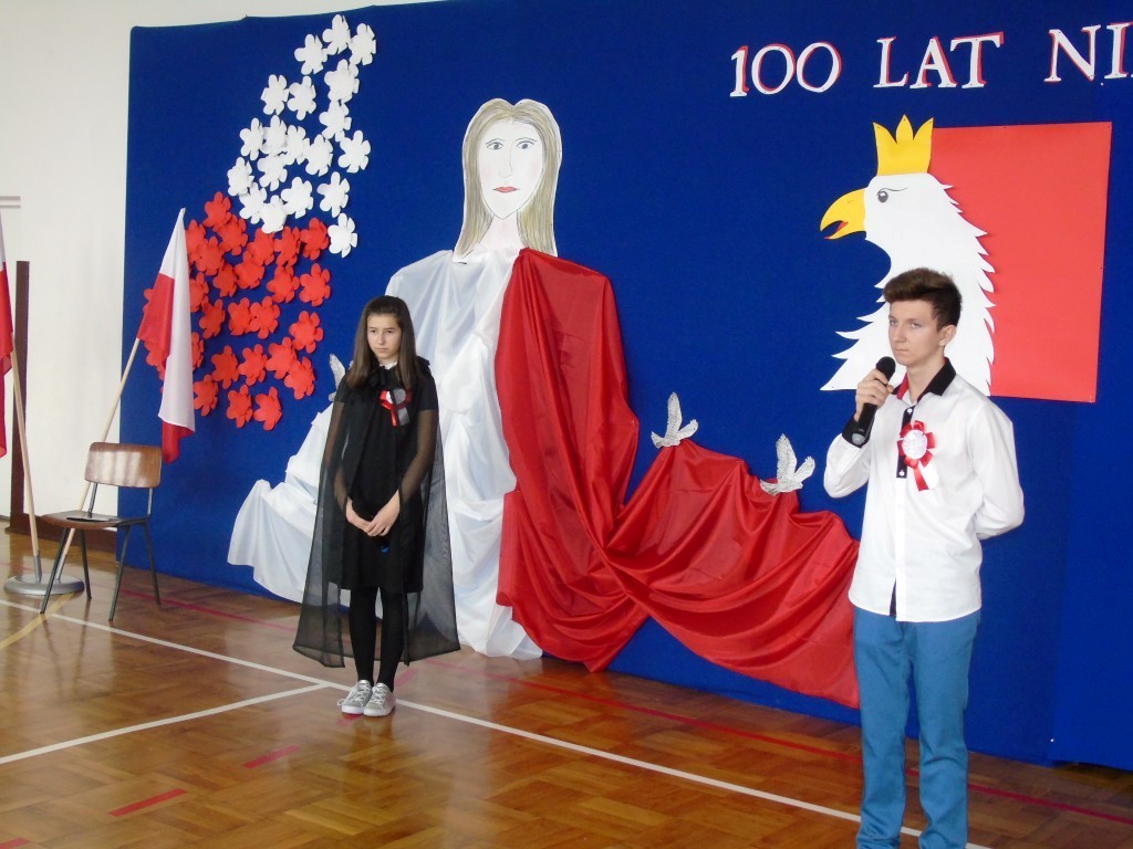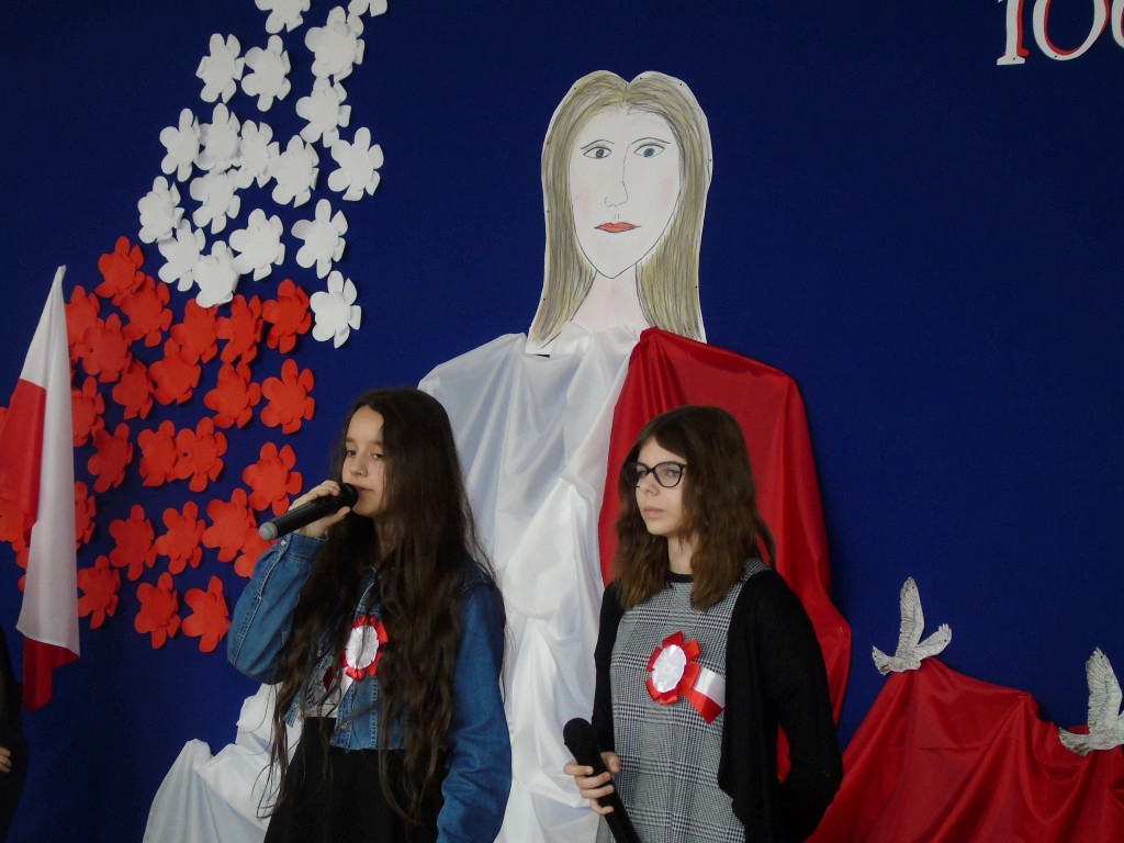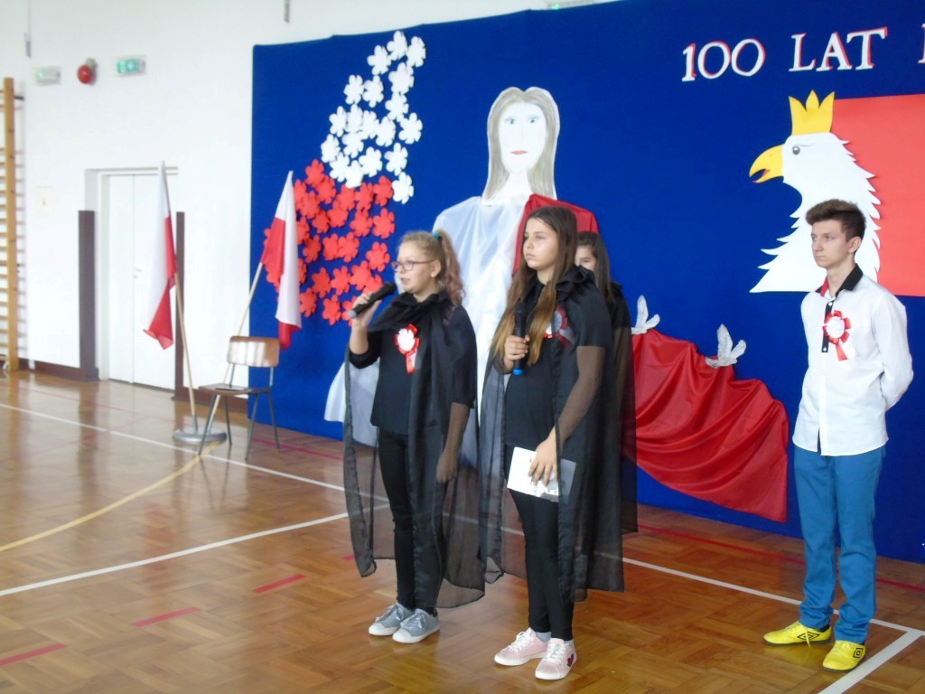 9 listopada 2018r. odbyła się akademia z okazji 100. rocznicy odzyskania niepodległości przez Polskę, uroczystość poświęcona ojczyźnie i wolności. Swoją obecnością zaszczycili nas zaproszeni goście: Pan Marcin Drewnowski – Przewodniczący Rady Gminy, Pani Agnieszka Gryzek – Dyrektor GCKiKF, Pani Edyta Kozak – Wiceprezes Stowarzyszenia „Czas na zmiany”, Zarząd Rady Rodziców: Pani Joanna Sułkowska, Pani Anna Gołębiowska, Pani Lidia Murawska, a także rodzice. O godzinie 11.11 cała społeczność szkolna oraz goście zaśpiewali cztery zwrotki hymnu państwowego, włączając się do akcji „Rekord dla Nieodległej”. Następnie uczniowie zaprezentowali przedstawienie ukazujące drogi do niepodległości, okraszone tańcem oraz śpiewem pieśni patriotycznych. Wspólne śpiewanie to hołd, jaki został złożony tym, którzy w wielkim trudzie i poświęceniu wywalczyli przed laty wymarzoną niepodległość. To także nasza radość, że mamy dziś wolną Polskę.