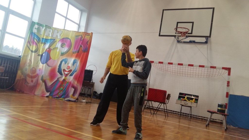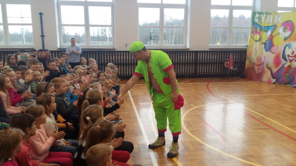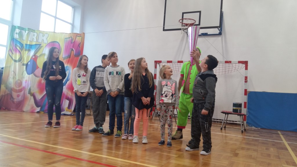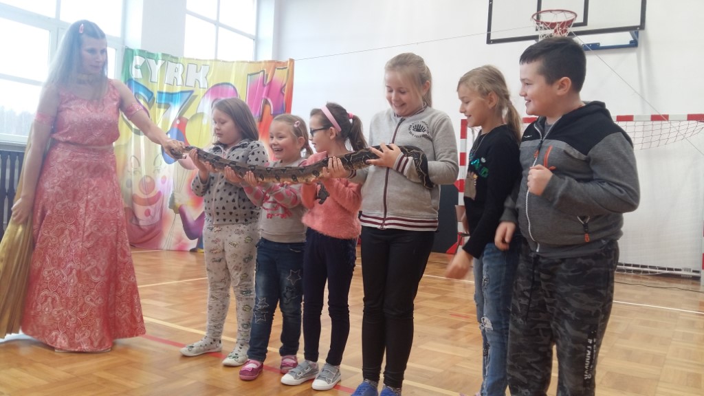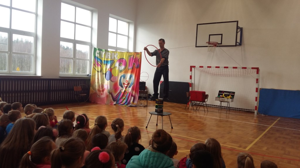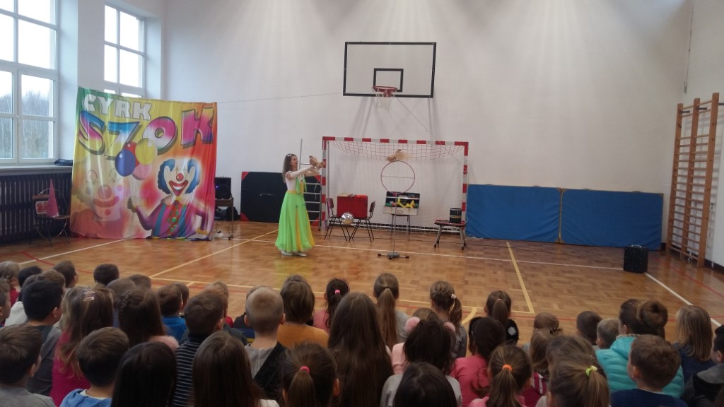 14.11.2018 r. do naszej szkoły przyjechał ukraiński cyrk „Szok”. Uczniowie, a także chętni rodzice obejrzeli ciekawy program artystyczny. Występ rozpoczął się od trudnego pokazu akrobatycznego. Wystąpił także wesoły klaun, który bawił dzieci swoimi sztuczkami. Wybrani przez artystów uczniowie nie tylko mieli okazję podziwiać triki cyrkowe, ale także brać czynny udział w realizacji wielu z nich. Pełni zapału, z różnym skutkiem, próbowali dotrzymać kroku zawodowcom, co często wzbudzało ogólną radość. Zapierającą dech w piersiach chwilą była ta, gdy artystka pojawiła się z wężem na rękach i wyszła do publiczności, aby każdy mógł go dotknąć. Niektóre dzieci wykazały się dużą odwagą głaszcząc długiego pytona. Były również pokazy żonglerki, iluzji, ekwilibrystyki.
