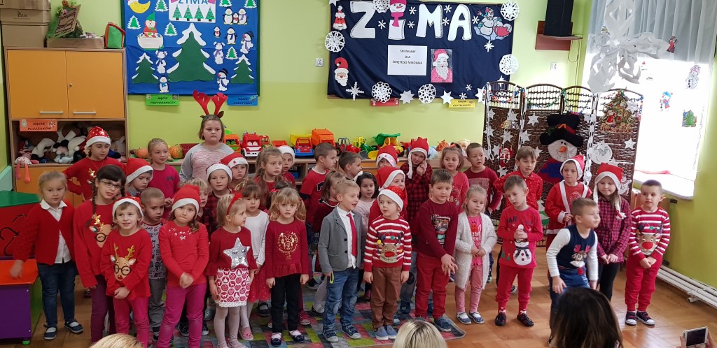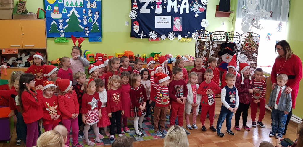 W czwartek 6 grudnia dzieci z oddziałów przedszkolnych przygotowały piosenki dla Świętego Mikołaja, na które zaprosiły Panią Dyrektor Justynę Turzyńską oraz Rodziców. Na tle świątecznej dekoracji najmłodsze dzieci śpiewem uczciły ten wspaniały mikołajkowy dzień. Ich artystyczny debiut bardzo spodobał się publiczności i został nagrodzony gromkimi brawami. Spotkanie zakończyło się słodkim poczęstunkiem i wspólnym zdjęciem.