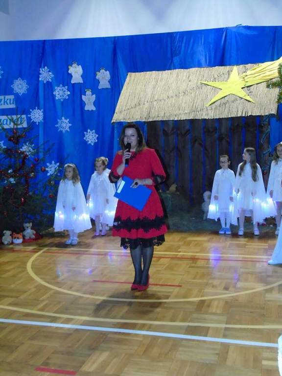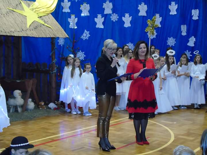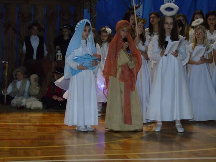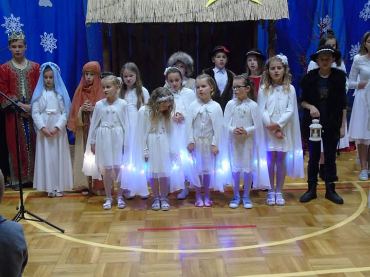 Następnie rozpoczęło się widowisko. W jasełkach udział wzięli: Maryja z Dzieciątkiem, Józef, anioły, pastuszkowie, królowie, kolędnicy z gwiazdą. Całą treść jasełek opowiadały teksty kolęd i pastorałek, do których uczniowie biorący udział w przedstawieniu dopasowywali gesty, ruch sceniczny i mimikę. Główna akcja rozgrywała się w szopce, gdzie narodził się Jezus Chrystus. Wokół Maryi, Józefa i Dzieciątka krzątały się zastępy anielskie, a zwierzęta trzymały straż. Przywitać Pana przybyli pasterze i królowie. Na koniec kolędnicy złożyli wszystkim przybyłym gościom życzenia świąteczne. Mali artyści wynagrodzeni zostali za przepiękne kreacje ról oklaskami i licznymi słowami uznania.