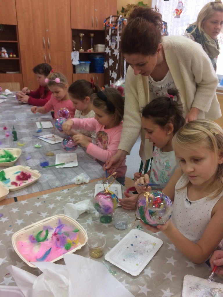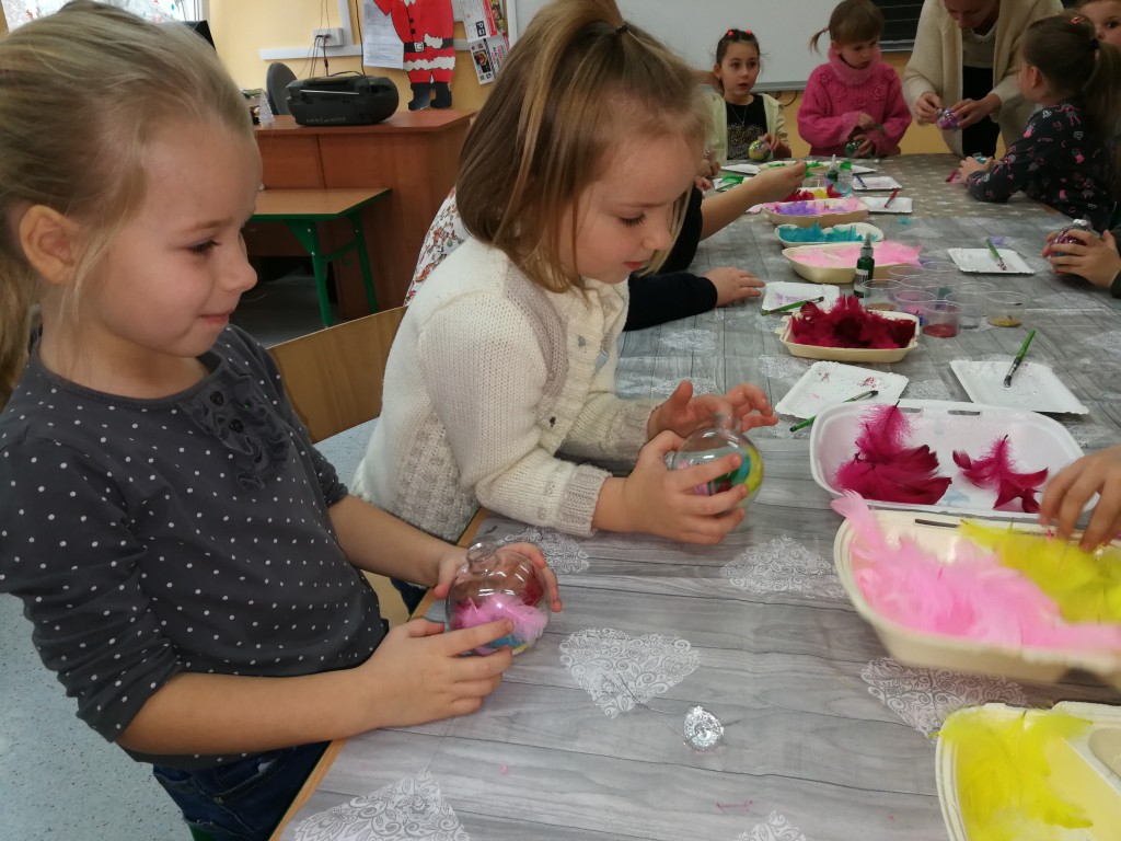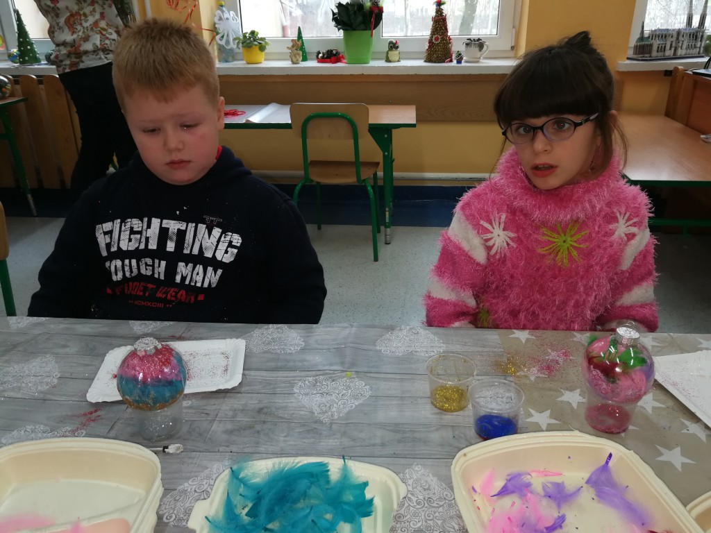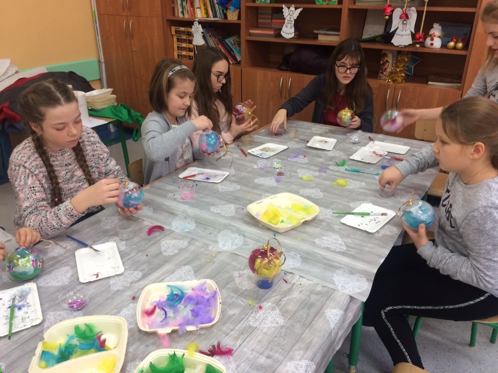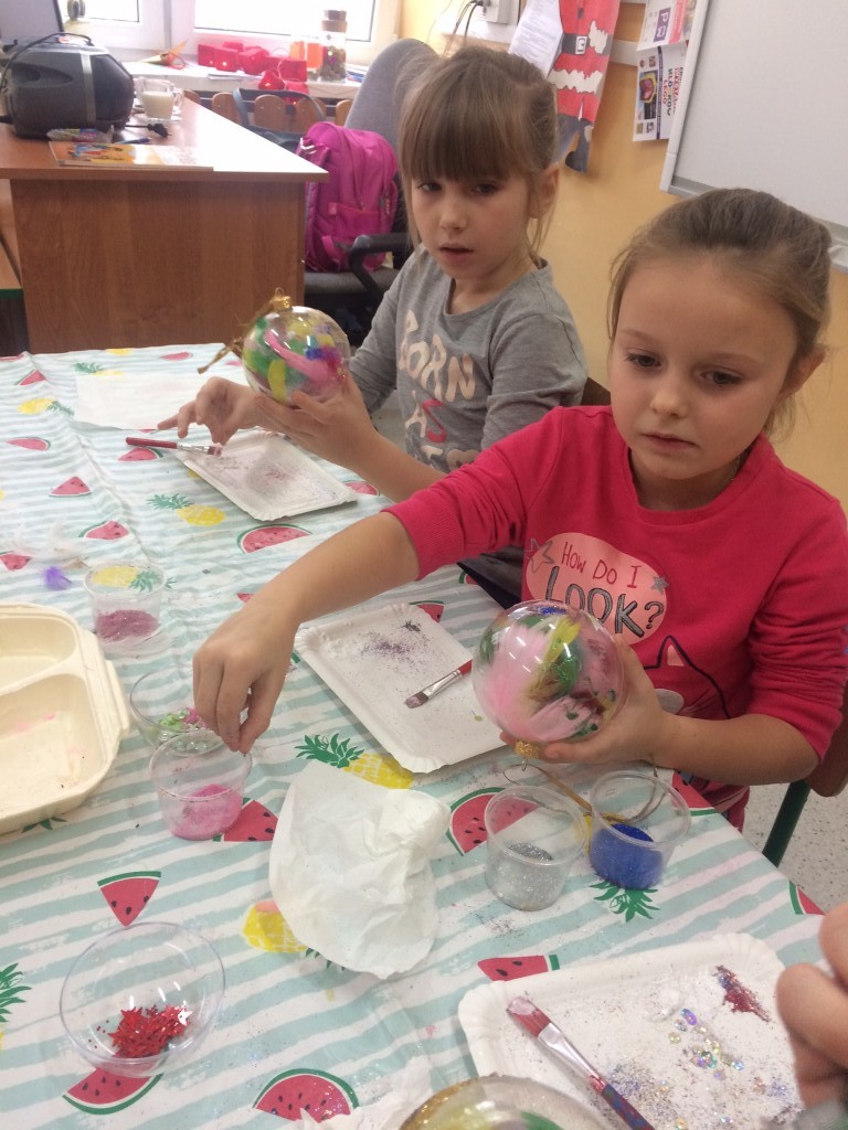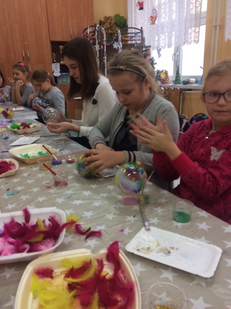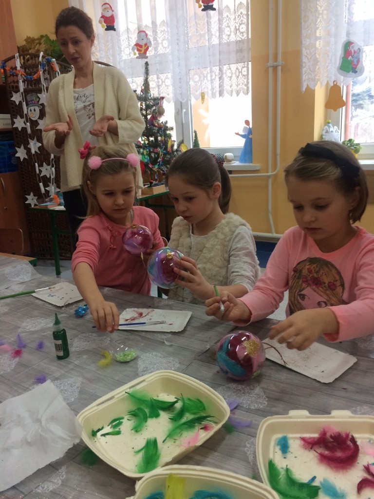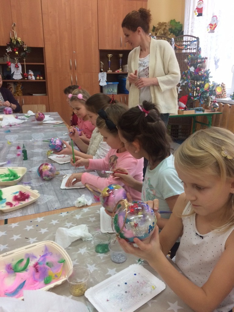 We wtorek 18.12.2018 roku sala lekcyjna zamieniła się w pracownię artystyczną. Uczniowie naszej szkoły podzieleni na 4 grupy brali udział w warsztatach zdobienia bombek. Uczestnicy wypełniali bombki kolorowymi piórkami, a następnie przyozdabiali je mieniącym się brokatem i błyszczącymi ozdobami. Dzieci z pomocą pań prowadzących warsztaty pakowały bombki i doczepiały do nich bilecik z imieniem osoby, której chcą ją podarować. Zajęcia dostarczyły nie tylko wiele radości, ale pozwoliły twórczo spędzić czas.