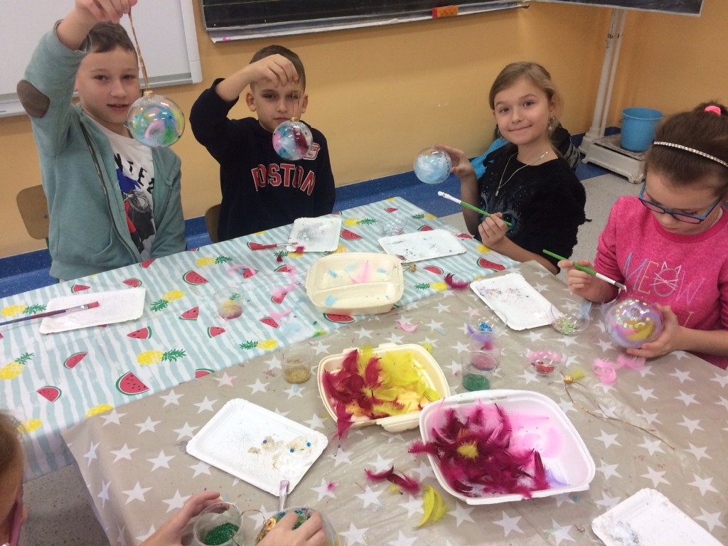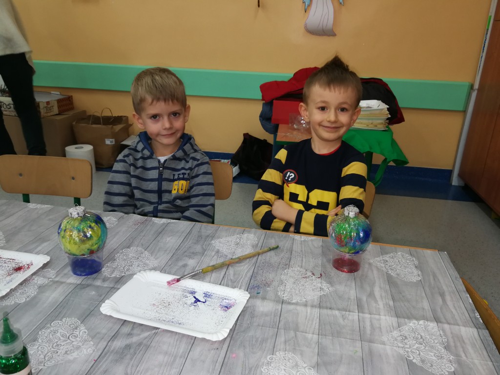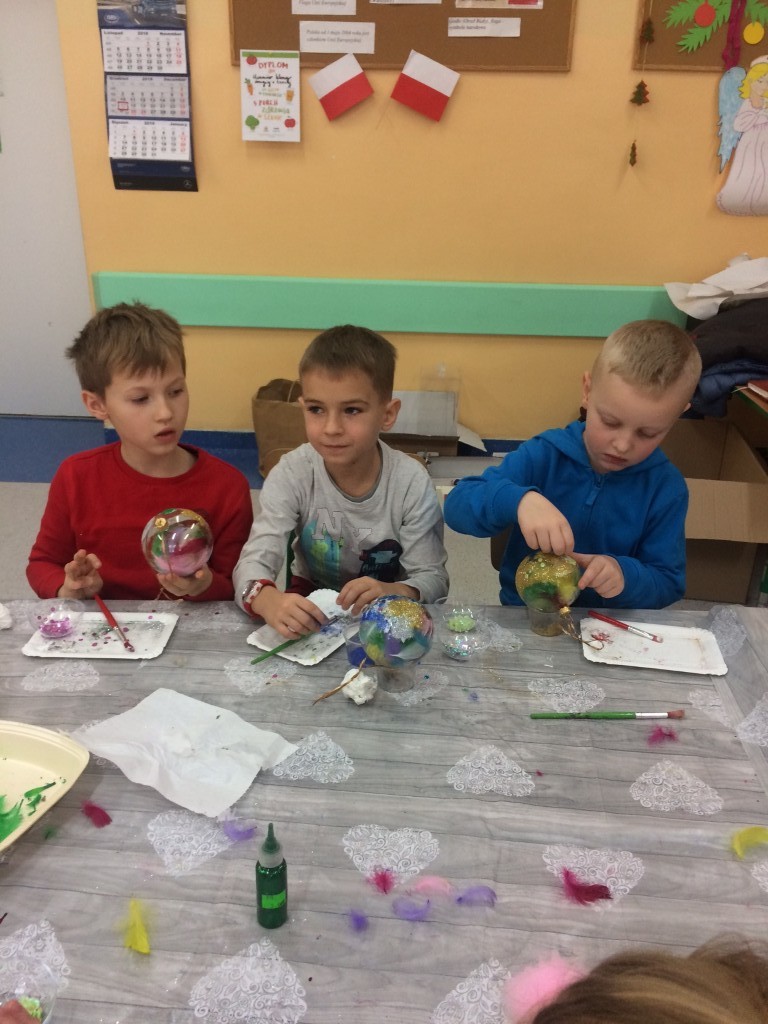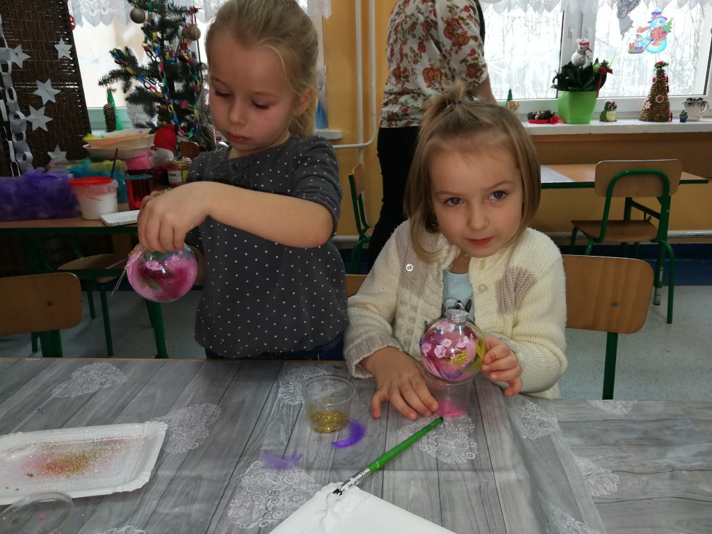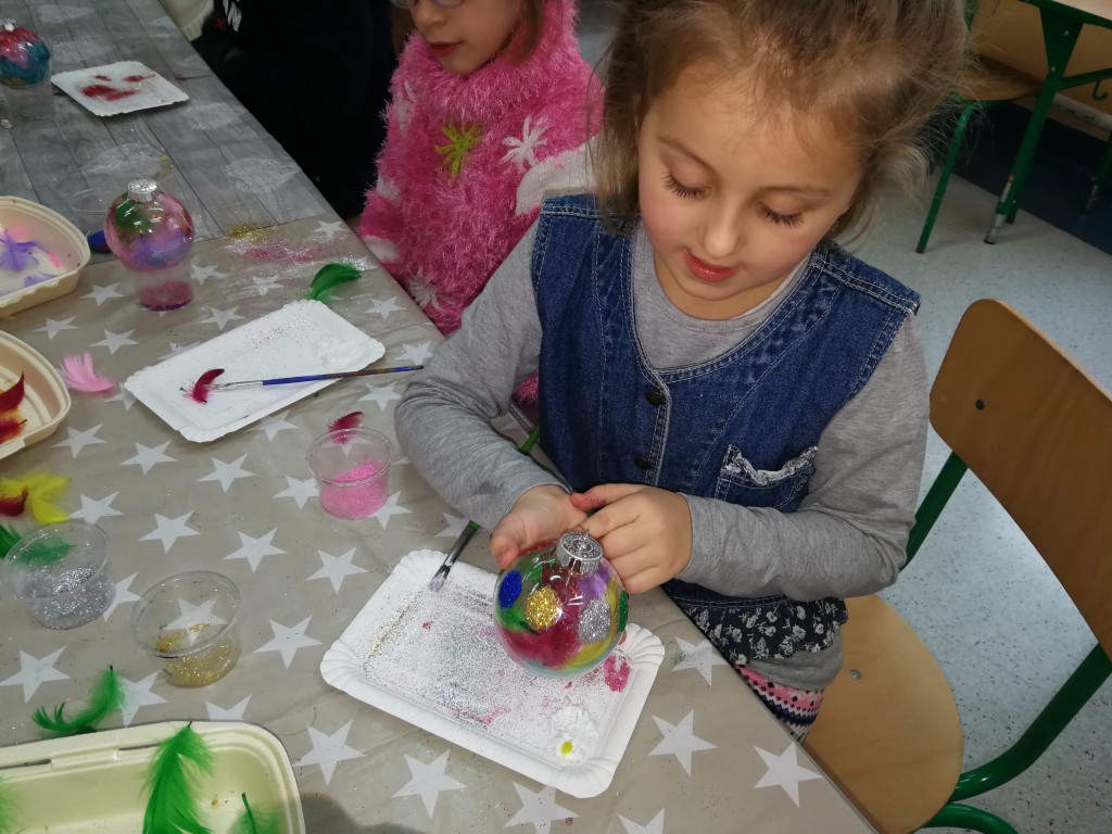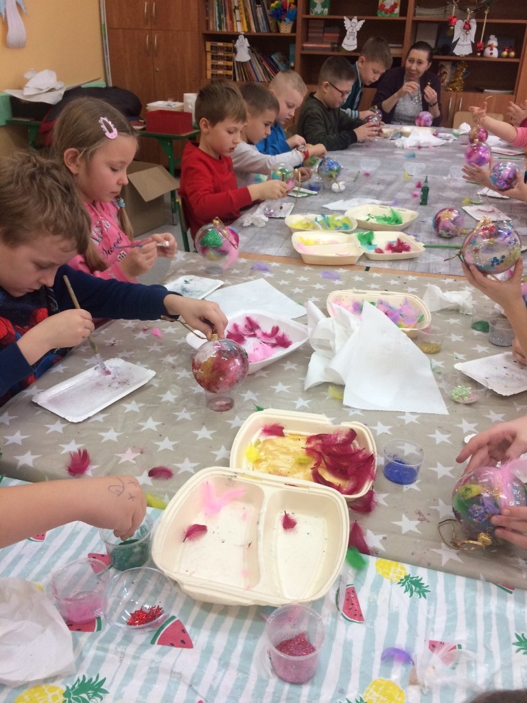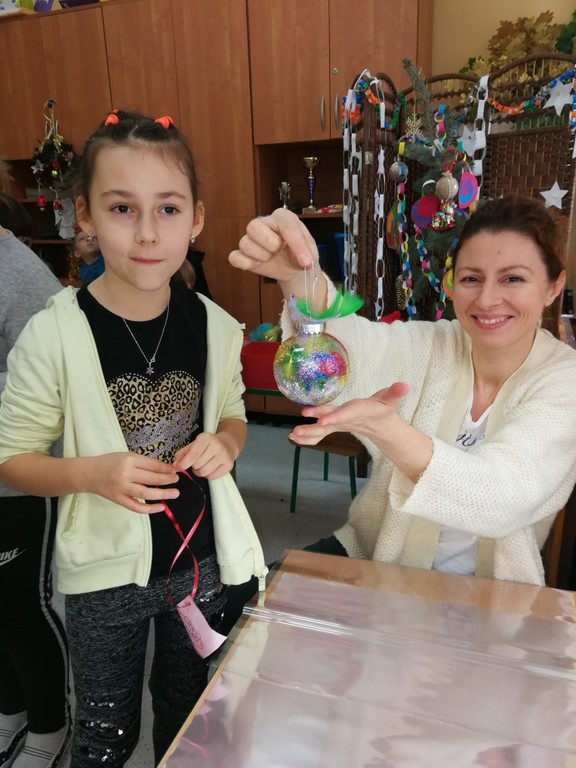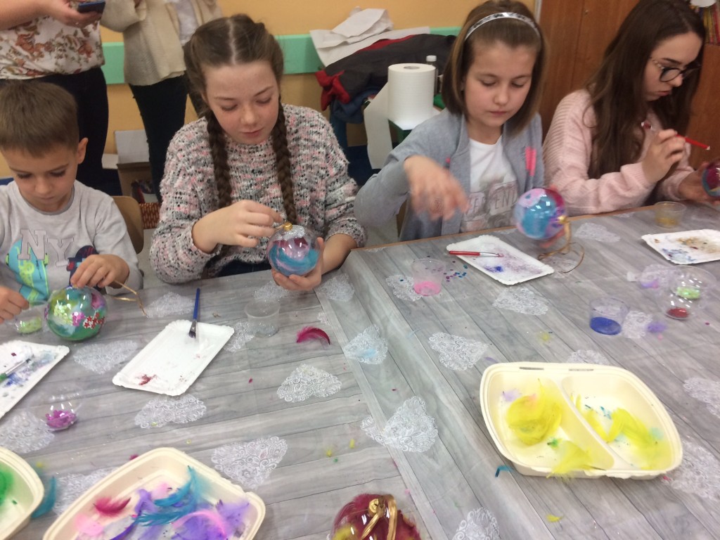 We wtorek 18.12.2018 roku sala lekcyjna zamieniła się w pracownię artystyczną. Uczniowie naszej szkoły podzieleni na 4 grupy brali udział w warsztatach zdobienia bombek. Uczestnicy wypełniali bombki kolorowymi piórkami, a następnie przyozdabiali je mieniącym się brokatem i błyszczącymi ozdobami. Dzieci z pomocą pań prowadzących warsztaty pakowały bombki i doczepiały do nich bilecik z imieniem osoby, której chcą ją podarować. Zajęcia dostarczyły nie tylko wiele radości, ale pozwoliły twórczo spędzić czas.