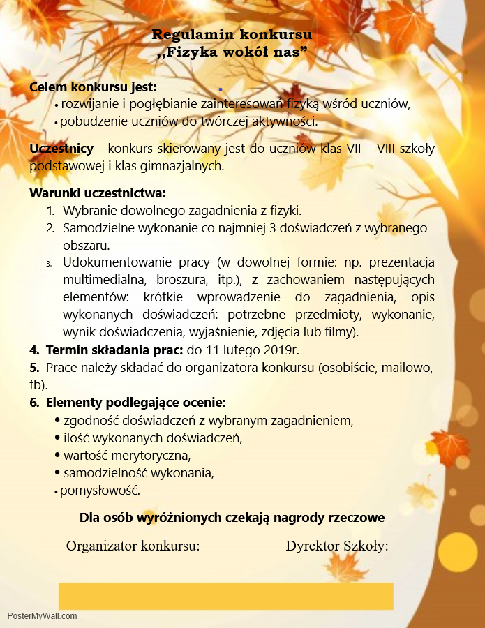 Zapraszam wszystkich uczniów klas VII – VIII oraz klas gimnazjalnych do udziału w konkursie ,,Fizyka wokół nas”.