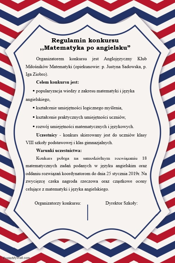W ramach działalności Anglojęzycznego Klubu Miłośników Matematyki zapraszamy wszystkich chętnych uczniów z klasy VIII i klas gimnazjalnych do udziału w konkursie ,,Matematyka po angielsku”.