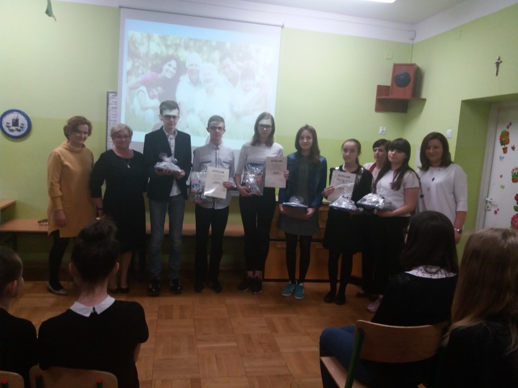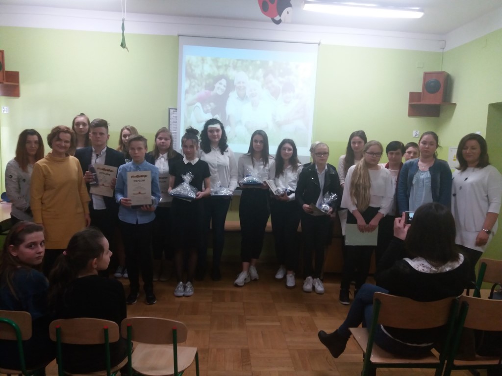 Następnie uczniowie naszej szkoły, przedstawili krótką część artystyczną, po której Pani Dyrektor Justyna Turzyńska wręczyła dyplomy i nagrody. Laureatami konkursu zostali: Jakub Kowalczyk, Kacper Pietrzyk, Aleksandra Kobza, Julia Trzaskowska, Michalina Karaś, Aleksandra Stachowiak. Po wręczeniu głównych nagród, pozostałym uczestnikom zostały wręczone dyplomy oraz upominki.
