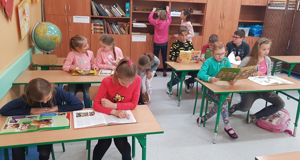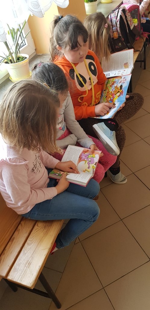 Dnia 15 maja cała społeczność szkoły włączyła się w ogólnopolską akcję bicia rekordu w czytaniu na przerwie pn. „IV PRZERWA NA CZYTANIE”. Już od 8 maja obchodzony był XVI Ogólnopolski Tydzień Bibliotek. Z tej okazji dzieci z oddziału przedszkolnego udały się na wycieczkę do Gminnej Biblioteki Publicznej w Jedlińsku, by tam przyjrzeć się bliżej pracy bibliotekarzy i funkcjonowaniu placówki. Pani bibliotekarka przeczytała dzieciom wiersze Jan Brzechwy. Ponadto maluchy obejrzały adaptację filmową „Mikołajka”. Pani dyrektor biblioteki przekazała drobne upominki w formie zakładek do książki.