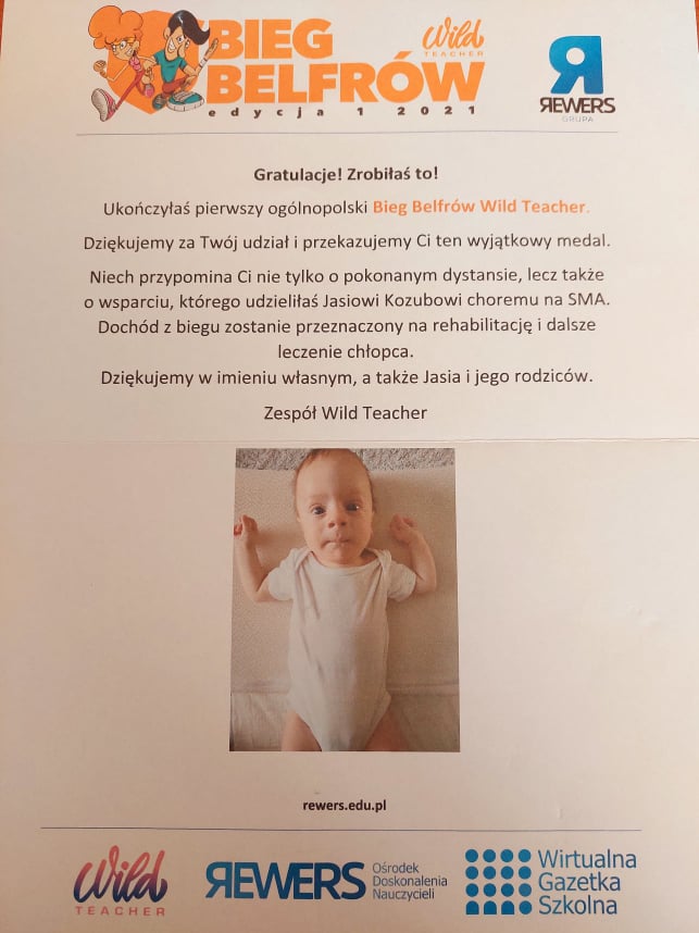 W naszej szkole organizujemy oraz bierzemy udział w różnego rodzaju akcjach charytatywnych. Tym razem włączyliśmy się w ogólnopolską akcję pn. Bieg belfra. Dzięki udziałowi w tym przedsięwzięciu udało Nam się pomóc choremu chłopcu. Cieszymy się, że nasza szkoła wspomogła Jasia w walce z chorobą.