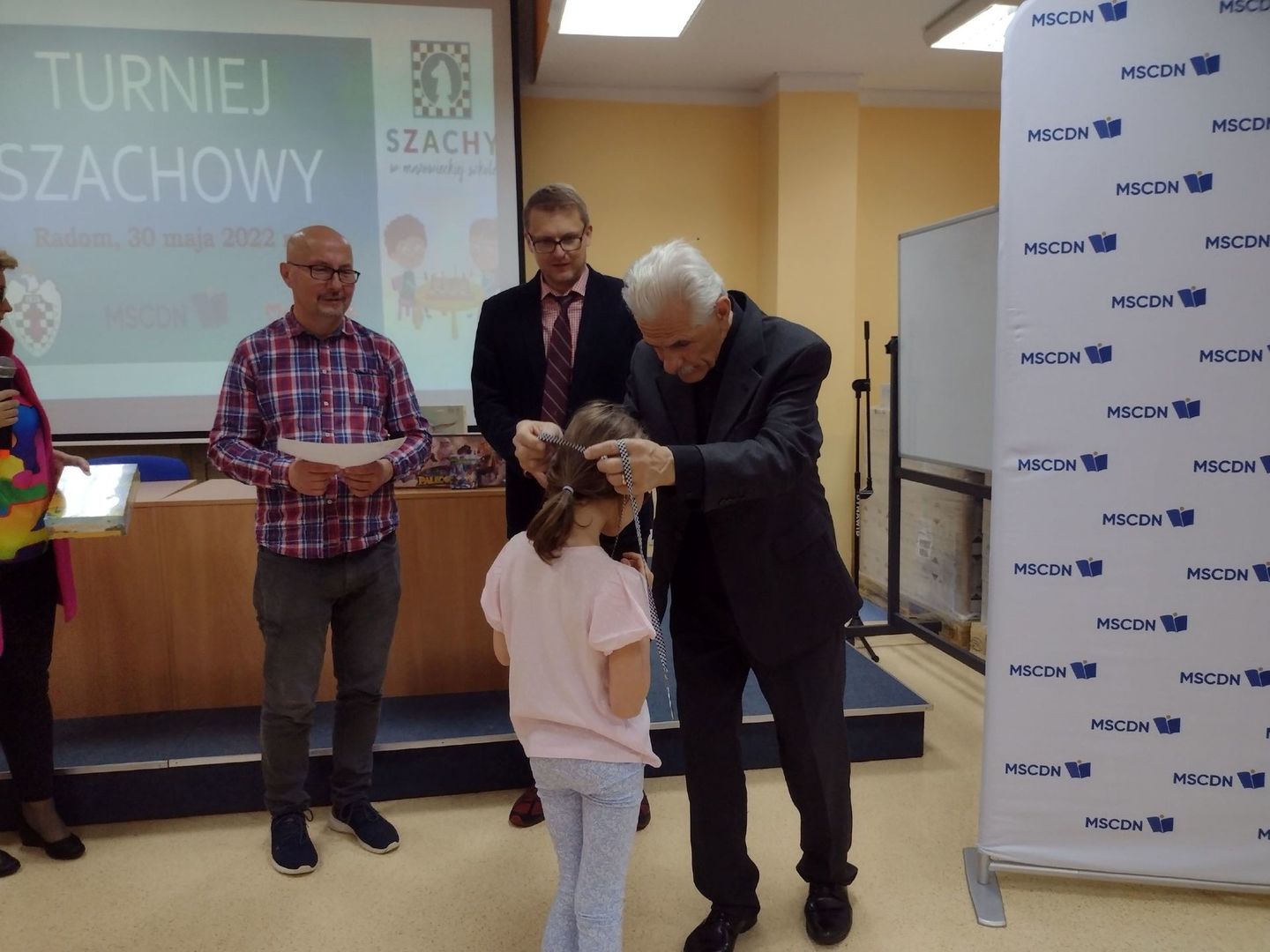 W Mazowieckim Samorządowym Centrum Doskonalenia Nauczycieli w Radomiu 30 maja 2022 roku odbył się Turniej Szachowy dla uczniów ze szkół biorących udział w projekcie "Szachy w mazowieckiej szkole " z Radomia i powiatu radomskiego. Współorganizatorami turnieju byli: Polski Związek Szachowy oraz Mazowieckie Samorządowe Centrum Doskonalenia Nauczycieli w Radomiu. Brali w nim udział uczniowie naszej szkoły: Jakub Jabłoński, Kamil Smyrda i Alicja Ścipień. Przygotowywała ich pani Agata Koperska-Ścipień. Młodzi szachiści sprawdzili swoje umiejętności oraz doświadczyli ciekawych przeżyć. Walczyli bardzo ambitnie. Każda partia królewskiej gry była zacięta, pełna emocji i zgodna z rycerskimi zasadami. Uczestnicy turnieju rozegrali po 7 rund w systemie szwajcarskim. Wiele radości sprawiło uczniom osiągnięcie osobistych sukcesów i zdobycie wspaniałych wyników. Alicja Ścipień zdobyła II miejsce, a Jakub Jabłoński III miejsce. Zwycięzcy otrzymali medale i nagrody w postaci gier logiczno - planszowych. Dodatkowo w prezencie szkoła dostała 10 zegarów szachowych. Gratulujemy wszystkim uczestnikom turnieju!!!