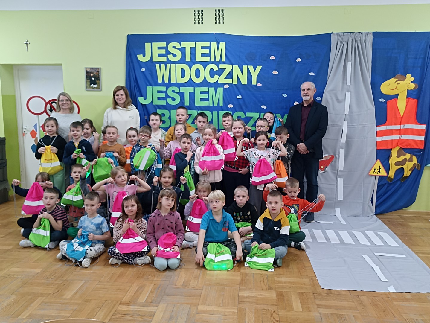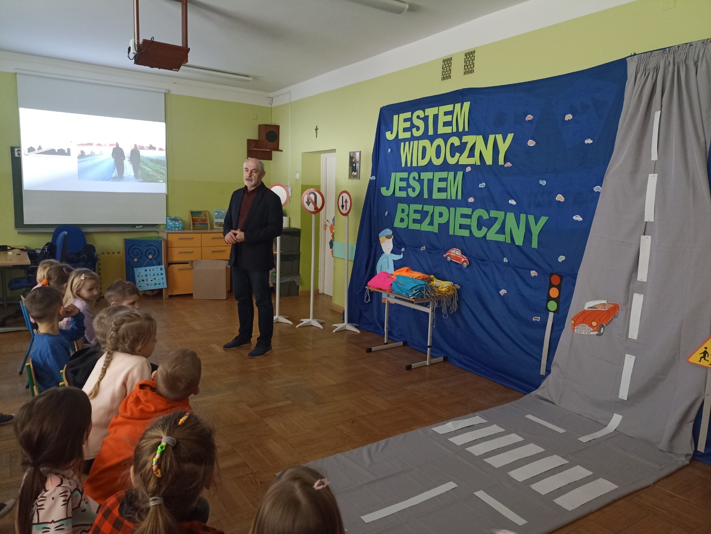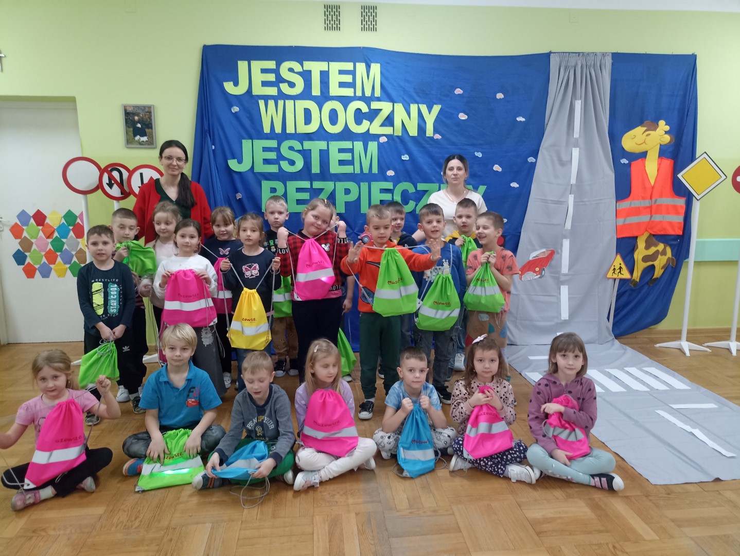 ,,Jesteś widoczny, jesteś bezpieczny" promującej bezpieczeństwo na drodze i noszenie odblasków po zmroku.🚦🦺Zasady i przepisy obowiązujące pieszych 🚶🚶w ciekawy sposób zaprezentował im przedstawiciel WORD Radom. Dzieci otrzymały upominki w postaci odblasków.🦺Dziękujemy za garść wskazówek i obiecujemy świecić przykładem. 👌