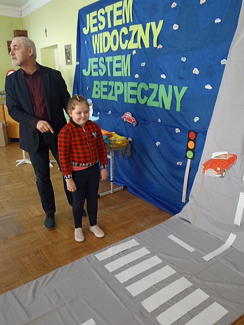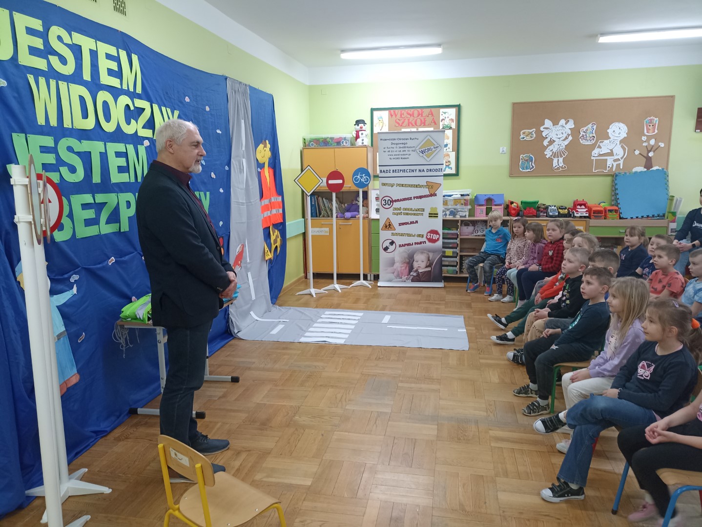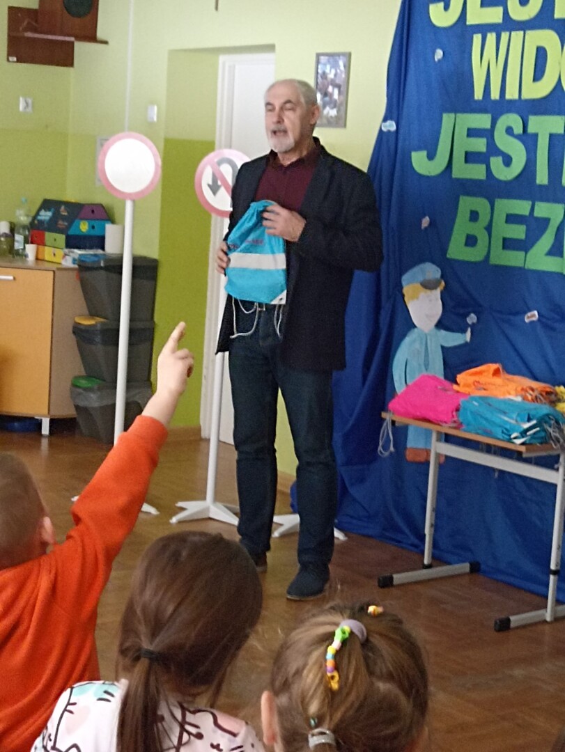 ,,Jesteś widoczny, jesteś bezpieczny" promującej bezpieczeństwo na drodze i noszenie odblasków po zmroku.🚦🦺Zasady i przepisy obowiązujące pieszych 🚶🚶w ciekawy sposób zaprezentował im przedstawiciel WORD Radom. Dzieci otrzymały upominki w postaci odblasków.🦺Dziękujemy za garść wskazówek i obiecujemy świecić przykładem. 👌