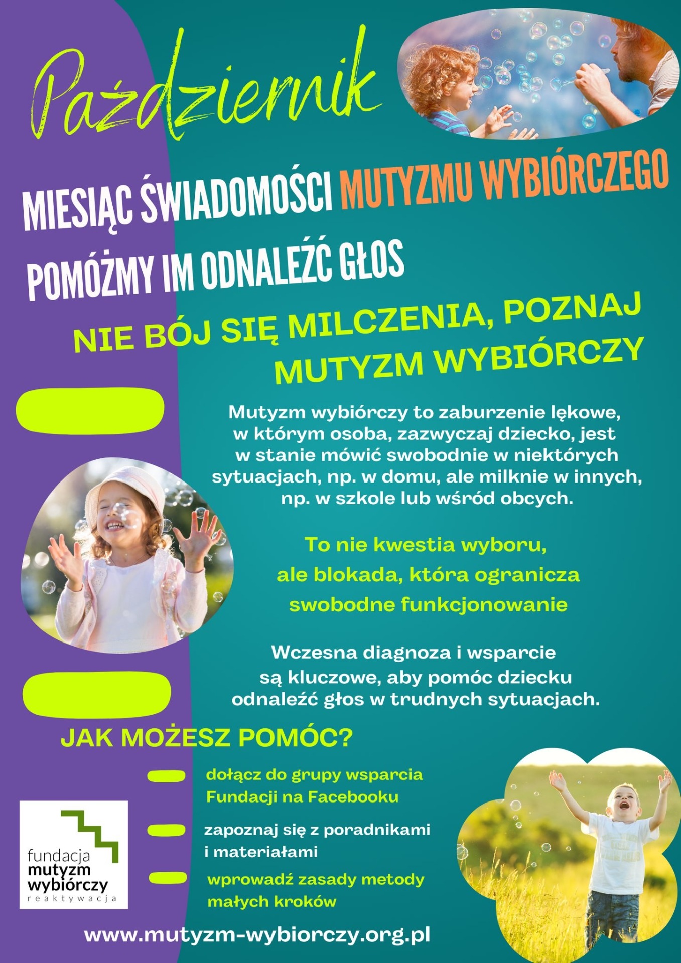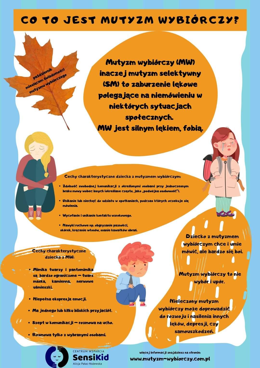 '️"(...) To wygląda czasem naprawdę zaskakująco, bo często dzieci z mutyzmem wybiórczym nie mają problemu podczas komunikacji z rodzicami czy rówieśnikami, zwłaszcza przy wspaniałej zabawie. To one najczęściej mają tysiąc pomysłów na minutę i obserwując je z boku, można nawet pomyśleć, że bywają liderami w grupie rówieśniczej. Ale tylko do pewnego momentu. Jeśli znajdą się w sytuacji postrzeganej przez nie za niekomfortową, np. podejdzie nauczyciel i o coś zapyta, natychmiast milkną jak zaklęte. Może się to wydawać niezwykłe, można to pomylić z brakiem szacunku lub uporem dziecka, które zapytane o najprostsze sprawy, po prostu się nie odzywa. Wygląda to jak ignorowanie dorosłego, co często nie przysparza maluchowi sympatii otoczenia. (...)"