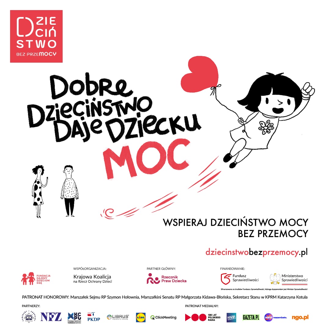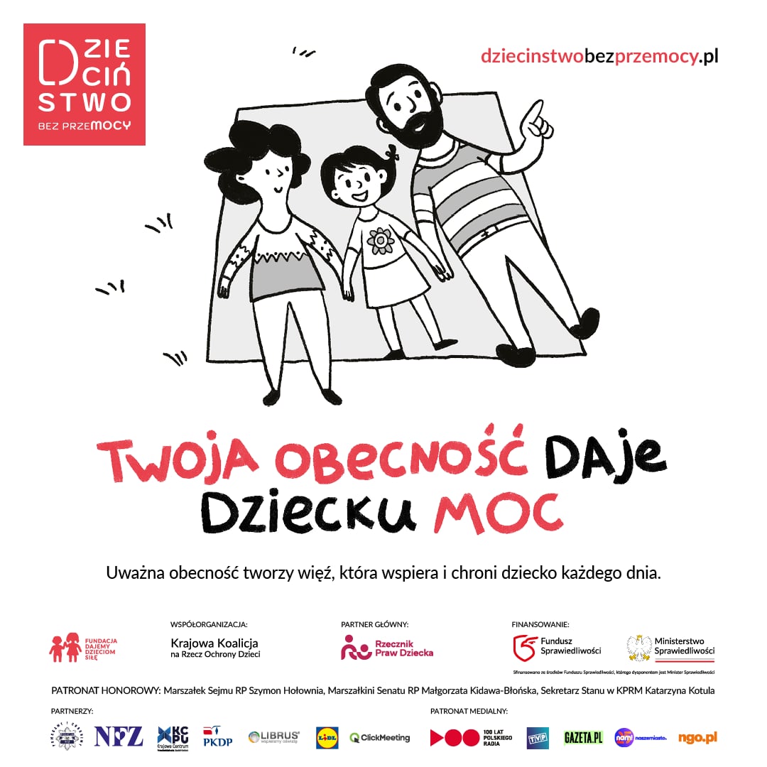 Dzieciństwo to fundament życia. Powinno być okresem wsparcia, obecności i docenienia przez dorosłych. Etapem życia, w którym dziecko czuje się bezpieczne, widziane i kochane. Dobre dzieciństwo daje dziecku moc! Dzieciństwo nie powinno kojarzyć się z krzykiem, lękiem ani bólem. Tymczasem większość dzieci w Polsce doświadcza przemocy. Nie tylko za zamkniętymi drzwiami domu — także w szkole, w relacjach rówieśniczych i w przestrzeni publicznej. Przemoc nazywana jest wychowaniem i dzieci muszą znosić ją w milczeniu. Wciąż funkcjonujemy w kulturze, która odbiera dzieciom głos i podmiotowość. Przemoc odbiera dziecku moc! Wierzymy, że można i trzeba to zmienić. Każde dziecko ma prawo do dzieciństwa wolnego od przemocy — bez bicia, krzyków, zawstydzania, kar i gróźb. Zmiana zaczyna się od nas. Od codziennych wyborów. Od uważności, obecności, cierpliwości. Od szacunku i miłości. Od tego czy i jak zareagujemy, gdy podejrzewamy lub wiemy, że dziecko jest krzywdzone i potrzebuje wsparcia. Pomoc przywraca dziecku moc! Dlatego mówimy wspólnie, głośno i wyraźnie: