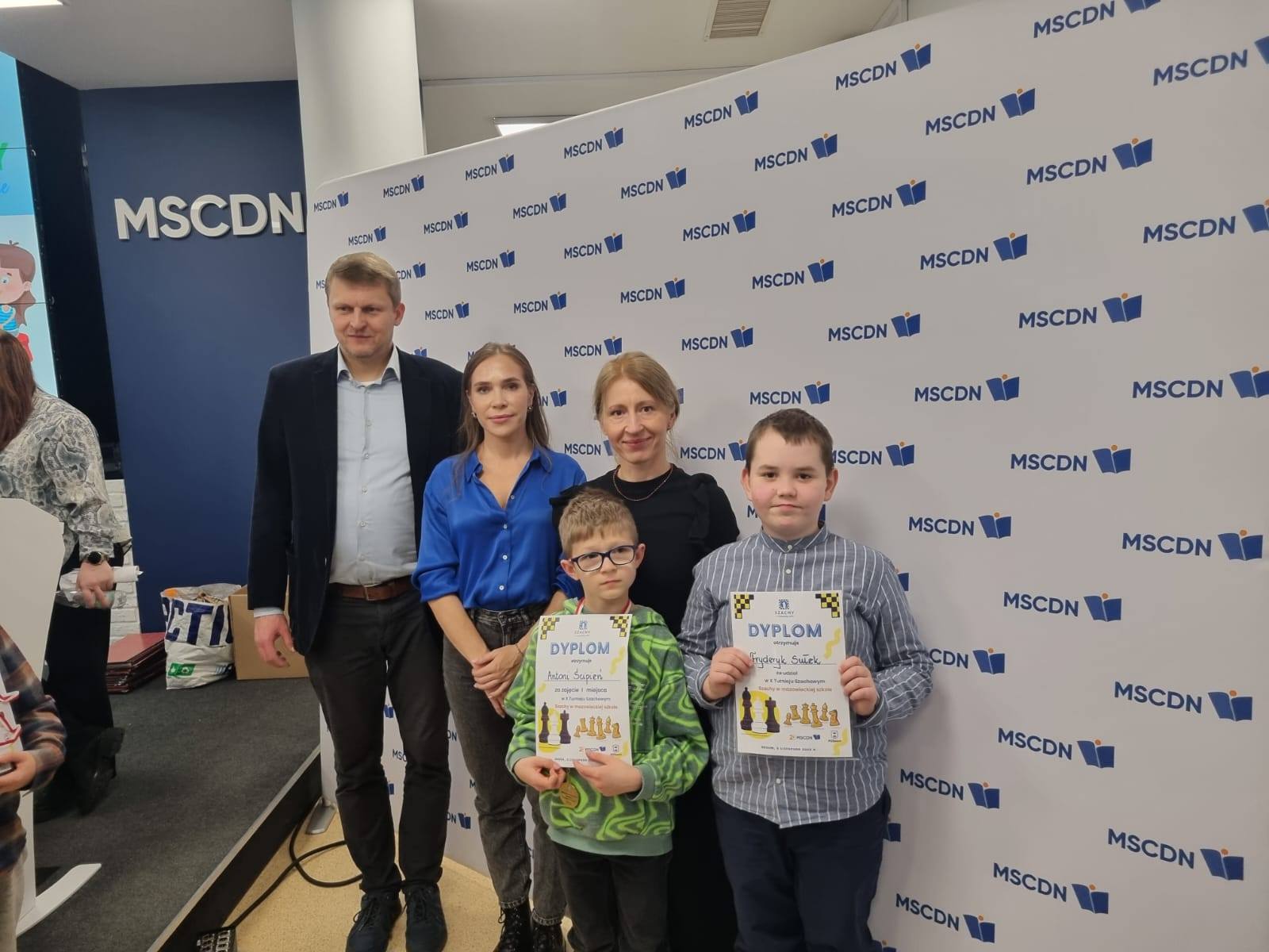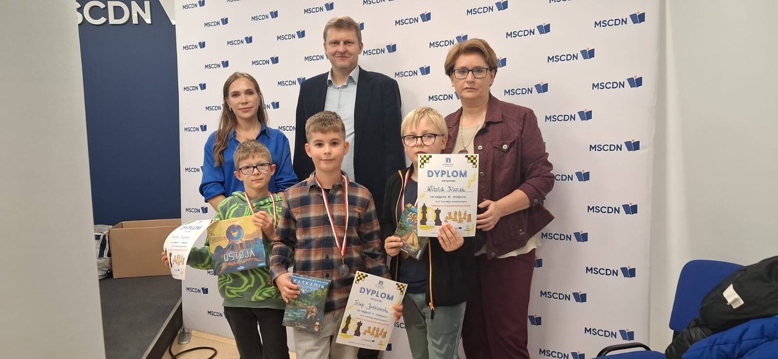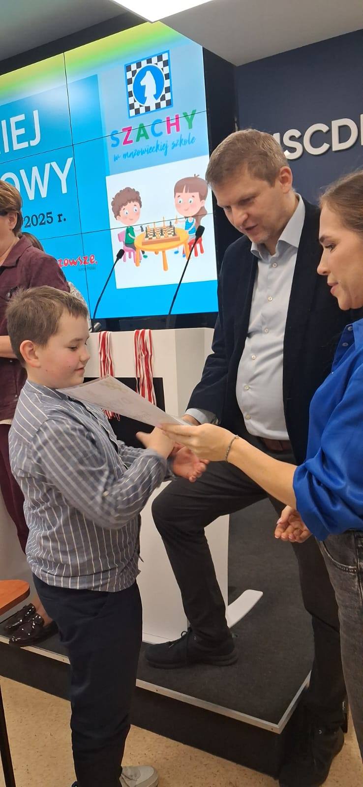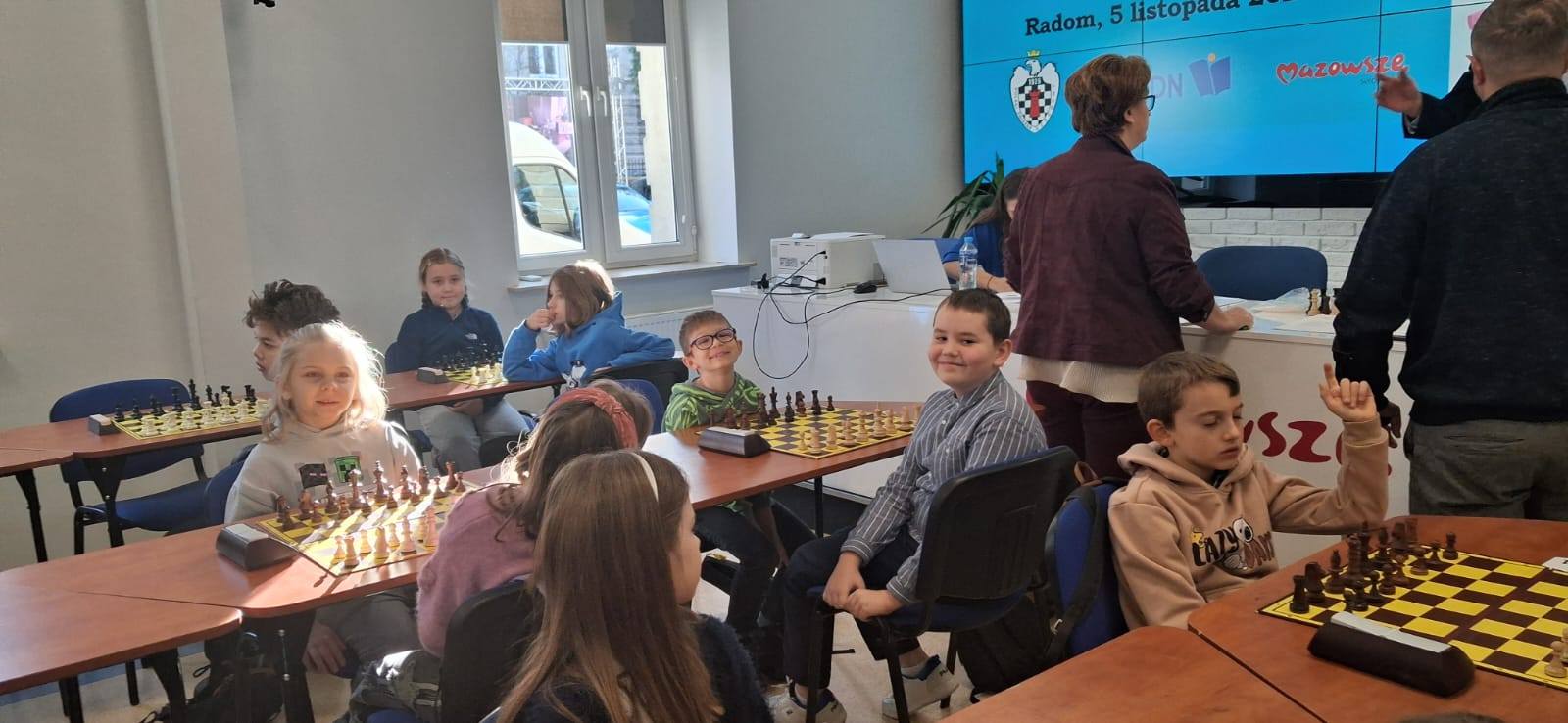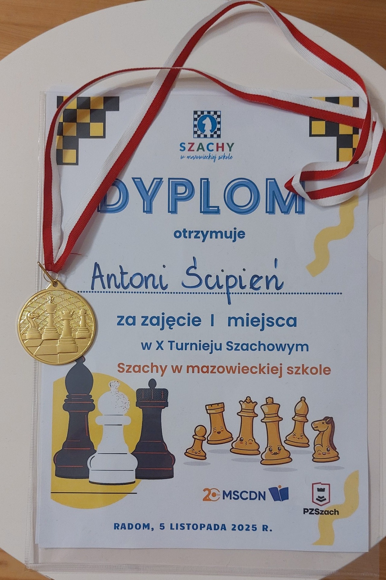 5 listopada 2025 roku w MSCDN w Radomiu odbył się X Turniej Szachowy " Szachy w Mazowieckiej Szkole" organizowany przez MSCDN i Polski Związek Szachowy PZSzach. Celem turnieju jest popularyzacja tej królewskiej gry i wyłonienie zwycięzców. W turnieju wzięło udział 12 szkół. Naszą szkołę reprezentowali uczestnicy pozaszkolnych zajęć szachowych: Fryderyk Sułek - kl. 3 i Antoni Ścipień - kl.3. Nasi szachiści zagrali partie zgodnie z systemem szwajcarskim, partia trwała 15 minut na zawodnika. Szachiści zaprezentowali wysoki poziom umiejętności gry w szachy. Antoni zdobył złoty medal wygrywając wszystkie partie, a Fryderykowi niewiele zabrakło do podium. Chłopiec zwyciężył w 3 partiach na 5 partii. Ponadto nasza szkoła otrzymała dwa zegary szachowe. Nasz medalista ma możliwość uczestnictwa w Finałowym Turnieju Szachowym, który odbędzie się w grudniu. Już dziś trzymamy za niego kciuki!