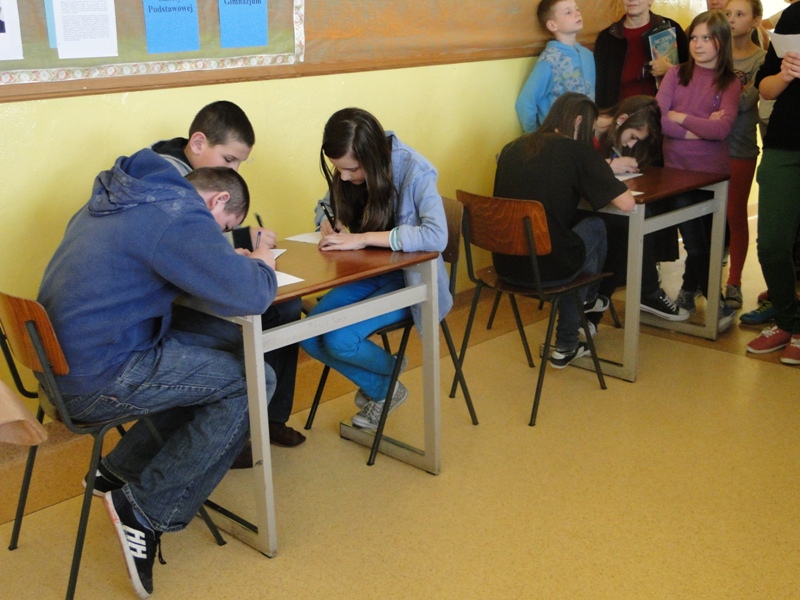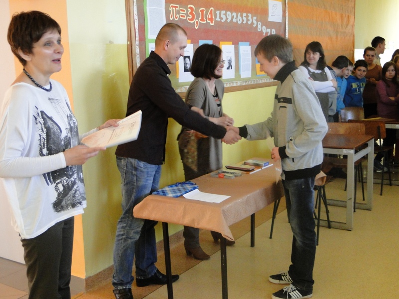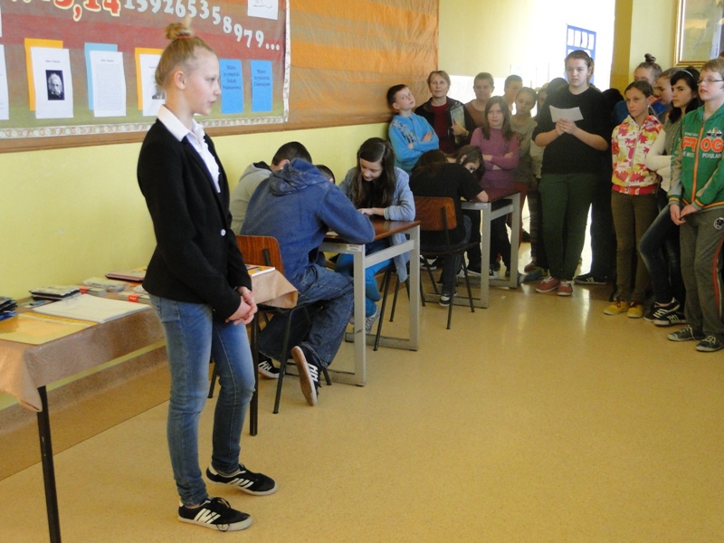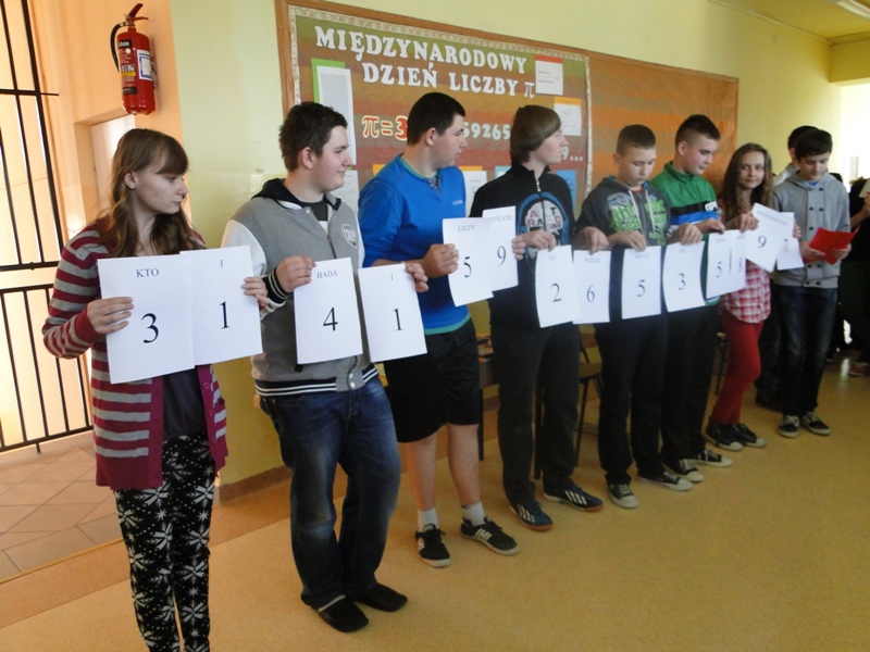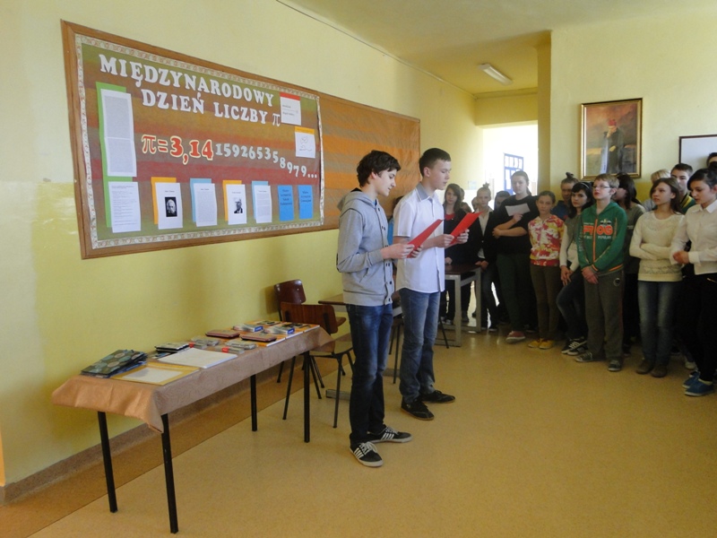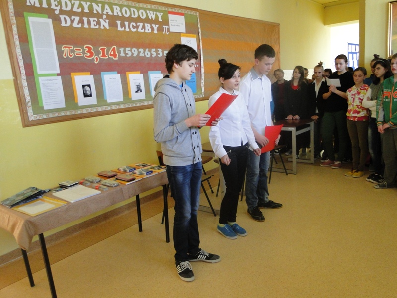 W naszej szkole odbył się krótki apel, na którym młodsi uczniowie dowiedzieli się, a starsi przypomnieli sobie, co wyraża i jakie zastosowanie ma stała matematyczna π. A nie jest to zwyczajna liczba, skoro nawet Wisława Szymborska poświęciła jej swój wiersz. Fragment tego wiersza zaprezentowała Monika Bolek z kl. IA. W trakcie deklamacji przedstawiciele pięciu klas rywalizowali ze sobą, kto napisze najwięcej wyrazów rozpoczynających się na „pi” (np. piłka, pisarz, pierogi). Zwyciężyła Wioletta Marszałek z kl. IIA.
